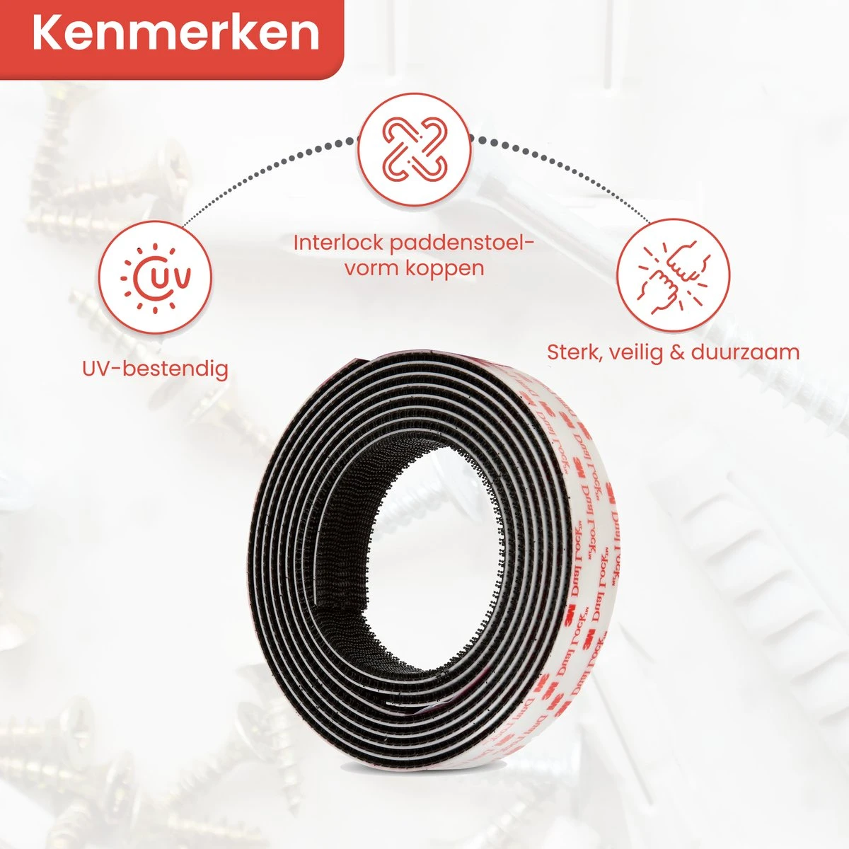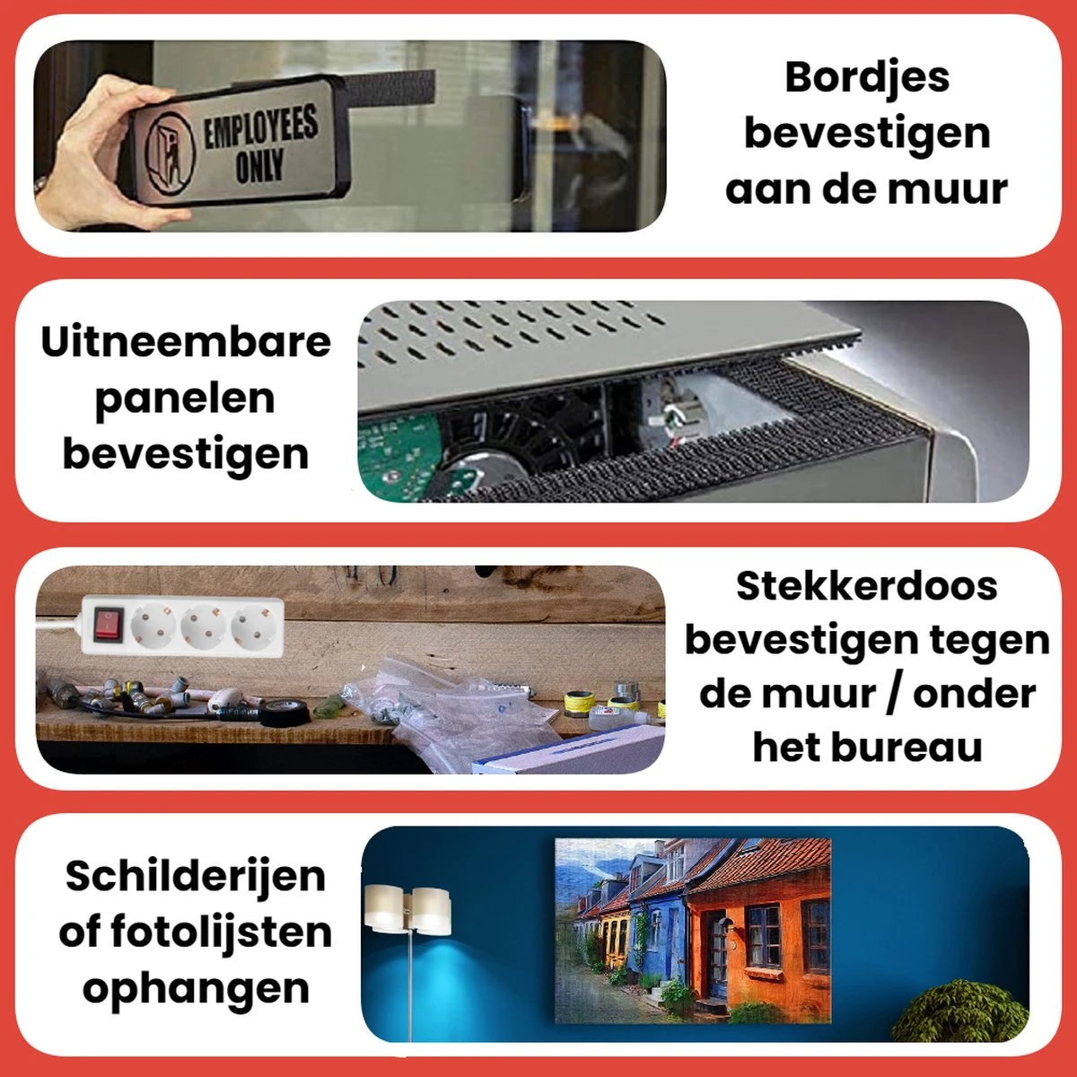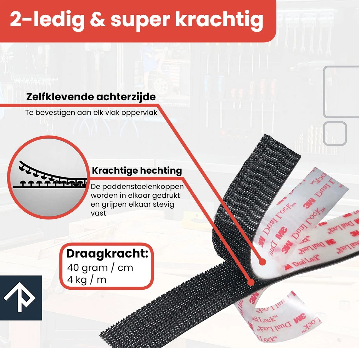 In de industrie wordt de 3Mâ„¢ Dual Lockâ„¢ druksluiting systeem al jaren met succes gebruikt door professionals. Dit zelfklevende high-tech-systeem kan worden toegepast voor het (tijdelijk) bevestigen van allerlei verschillende voorwerpen, zoals bijv. stekkerdozen, gereedschap, lijstwerk enz.