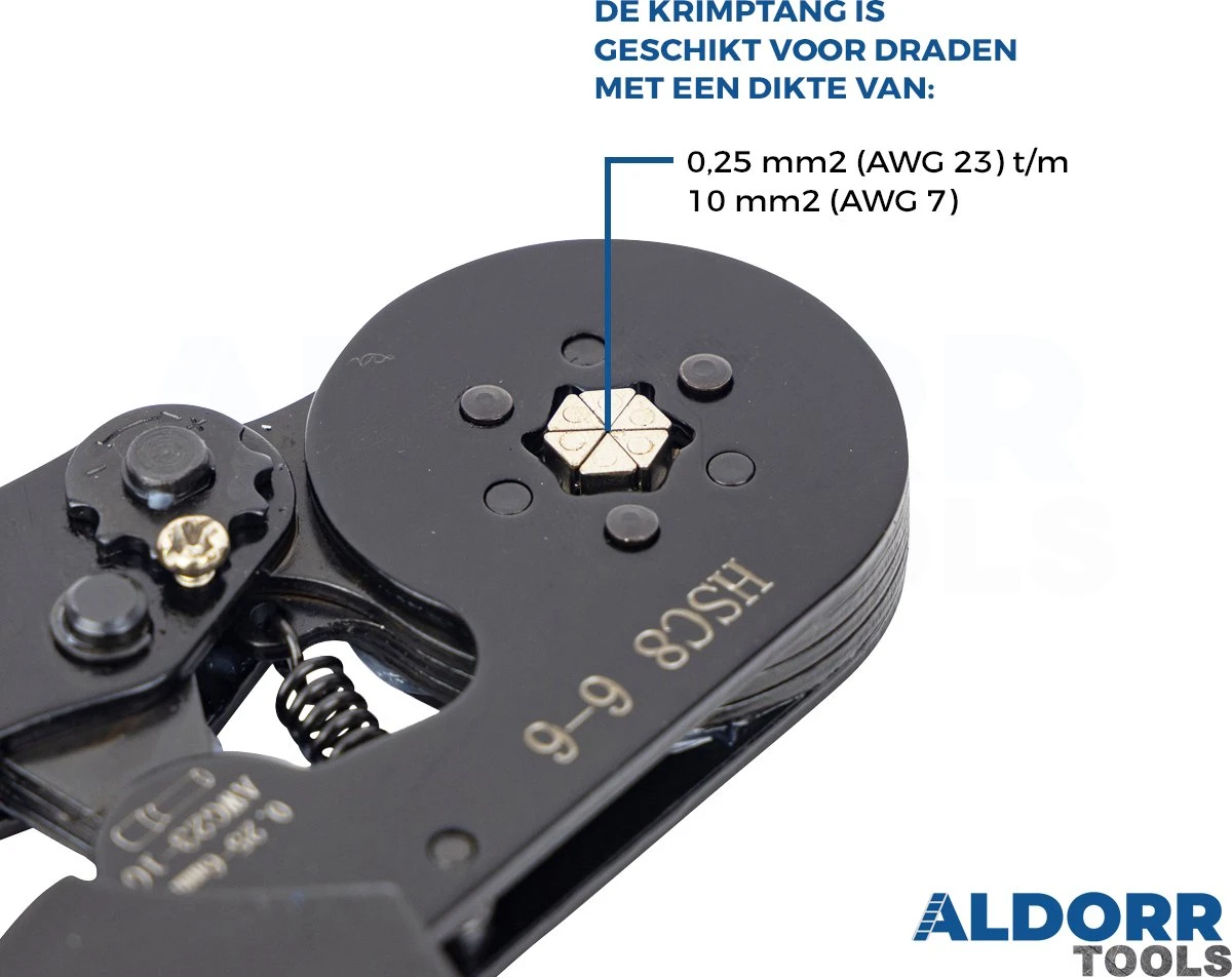 De ALDORR Adereindhulstang heeft een zeskante persing. De tang is geschikt voor kabels met een dikte van 0,25-6 mm2. De dikte van de kabel staat vrijwel altijd vermeld op de kabel zelf. De dikte van deze kabel komt overeen met AWG 23 tot 10.
