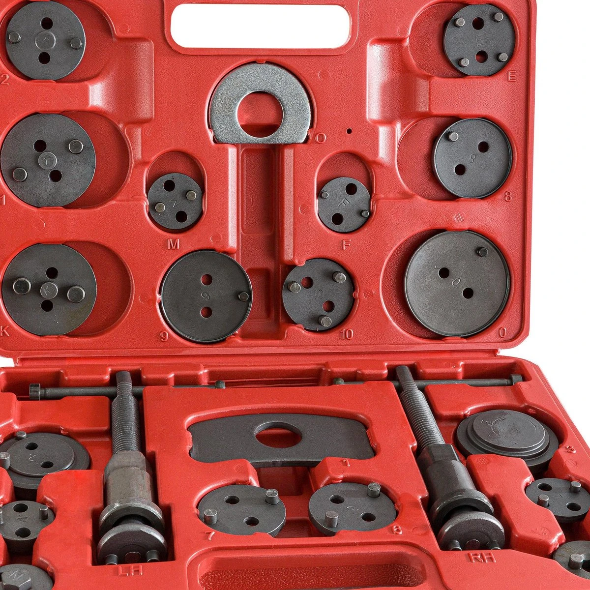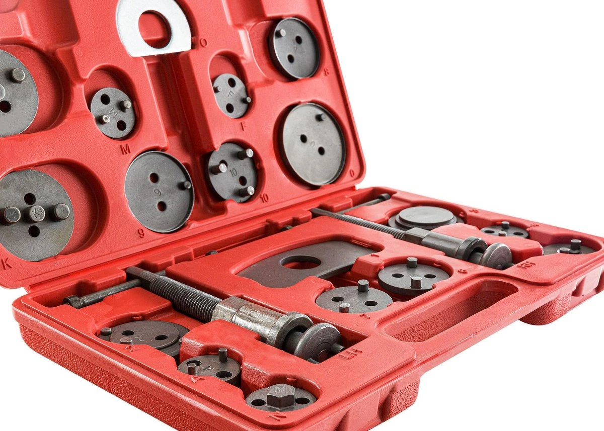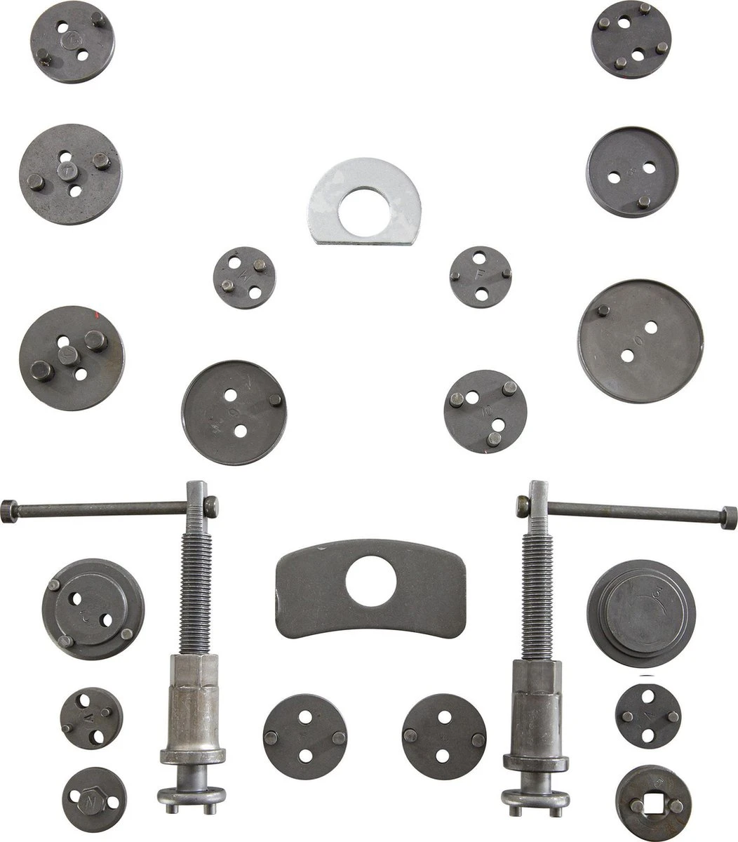[UITGEBREID] Deze uitgebreide 22-delige set is universeel en daarom geschikt voor bijna alle gangbare automerken. Deze set is vereist voor auto’s met remklauwen met ingebouwde handrem, d.w.z. dat de trekkracht van de handremkabel direct op de zuiger van de schijfrem werkt.