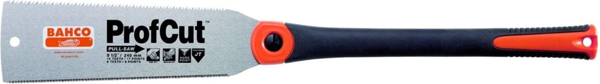 Handzaag met trekkende zaagbeweging. Flexibel zaagblad en tanden aan beide kanten van het zaagblad. Speciaal geslepen Triple Edge tanden voor snel en precisie zagen, langszagen en afkorten. Met ophanggat.