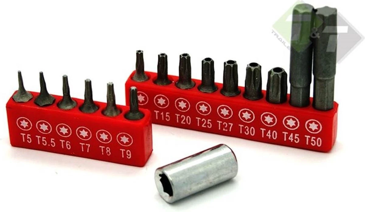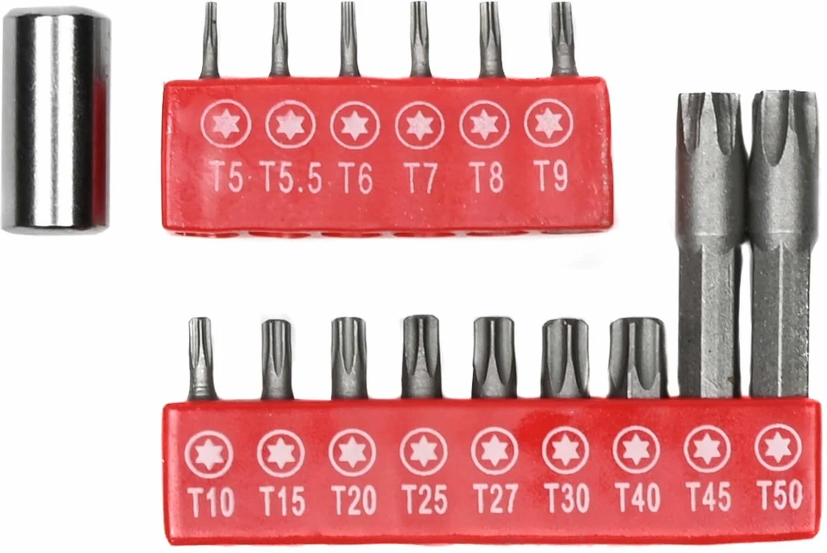 - 14 Torx bitjes (T5, T5.5, T6, T7, T8, T9, T10, T15, T20, T25, T27, T30, T40 en T45) van ongeveer 25 mm lang