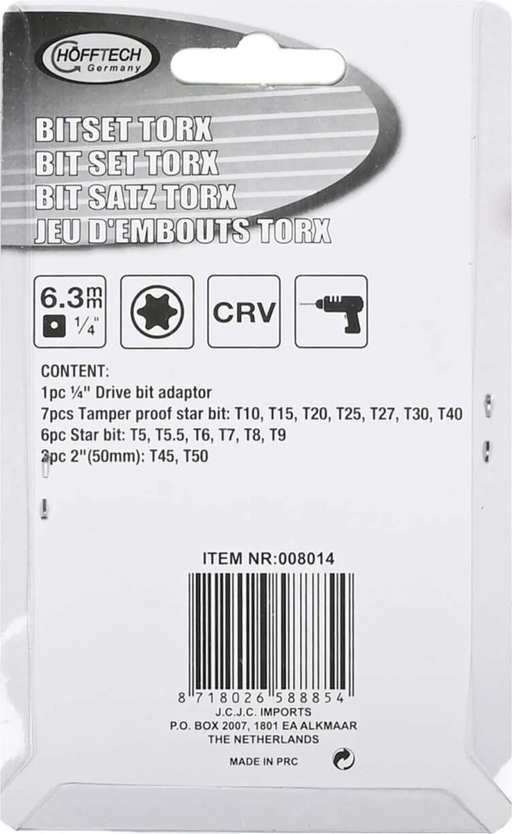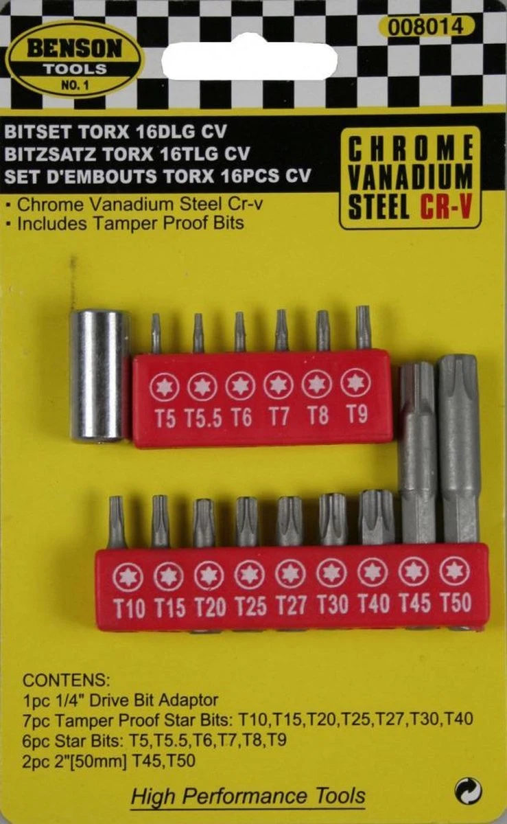 Zoekwoorden: Benson, Bitset, Torx, Chroom Vanadium, gereedschap, klussen, kwaliteit, duurzaam, handig, hoge kwaliteit, complete set, bits, bithouders.