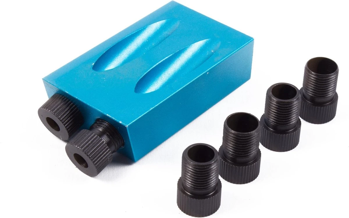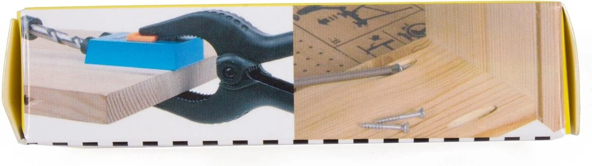 Zoekwoorden: pocket boring mal, pocket hole verbindingen, 15 graden boormethode, 6, 8 en 10 mm geleide gaten, lijmtang (niet meegeleverd).