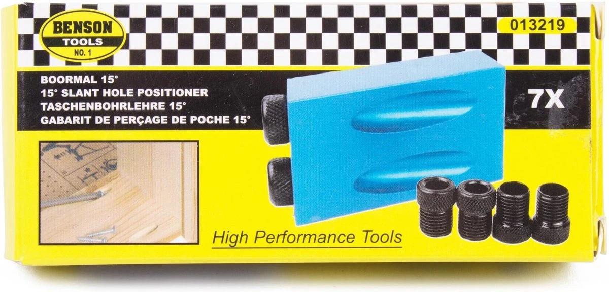 Benson Boormal 15 graden – Pocket Boring Mal – 7 delig is een innovatieve oplossing voor het creëren van pocket hole verbindingen. Met deze 7-delige mal bevestig je moeiteloos waardevolle schroefverbindingen in een perfecte 15 graden hoek. De mal is gemaakt van een vast blok aluminium en heeft een gepolijste, roestbestendige coating voor een lange levensduur. De mal is voorzien van 6, 8 en 10 mm geleide gaten en de lijmtang (niet meegeleverd) zorgt ervoor dat de mal eenvoudig op z’n plaats klemt.