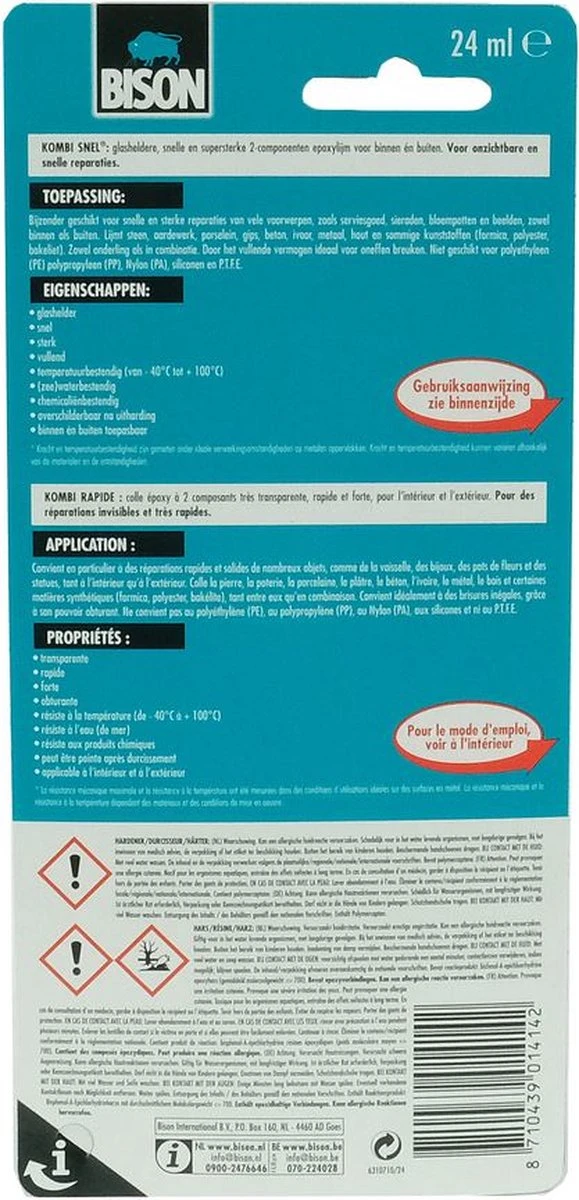 Kombi snel is een universele glasheldere 2-componenten epoxylijm. De lijm is watervast, zeer sterk en heeft een temperatuurbestendigheid van -40°C tot +70°C. De lijm heeft een zeer snelle uithardingstijd en daardoor een verwerkingstijd van 4 minuten. Handvasttijd 10 minuten. Toepassingsgebied: lijmt metaal, steen, hout, aardewerk, porselein, ivoor, edelstenen en kunststoffen (zoals formica, polyester en bakeliet) onderling en in combinatie. Niet geschikt voor de meeste soorten plastic, polyethyleen, teflon en siliconenrubber. Met gratis spatel en mengbakje.