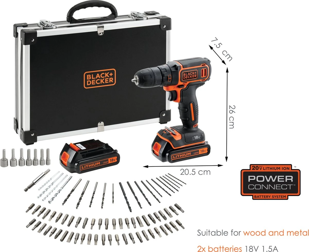 Met deze BLACK+DECKER BDCDC18BAFC-QW accu schroef- /boormachine met 2x 18V Lithium-Ion accu’s, koffer en 80 accessoires, heb je meteen het materiaal om al jouw schroef- en boortaken uit te voeren. De BLACK+DECKER BDCD18BAFC-QW is ideaal voor het boren in hout en metaal , alsook voor allerhande schroefklussen dankzij zijn 10 koppelinstellingen. Door de variabele snelheid van dit toestel heb je steeds optimale controle tijdens het boren en schroeven.