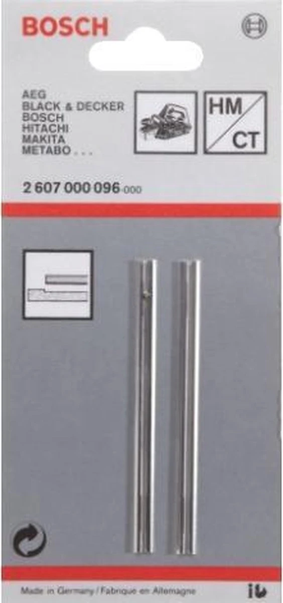 Hardmetaal. Recht model. 2-zijdiggeslepen. Afschuinen tot 35°. Voor schaafmachines AEG, Bosch, Black & Decker, Fein, Haffner, Hitachi, Holz-Her, Mafell, Makita, Metabo en Skil.