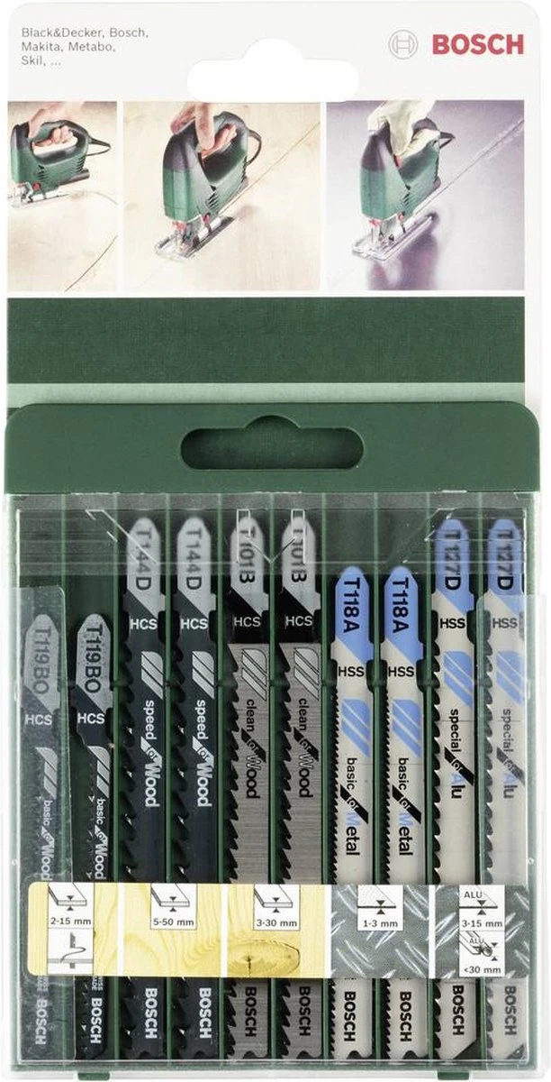 Deze set decoupeerzagen is geschikt voor het zagen van hout en metaal. De zaagbladen hebben een T-aansluiting en hierdoor passen de zaagbladen o.a. op de decoupeerzagen van Bosch, Black & Decker, Makita, Metabo, en Skil.