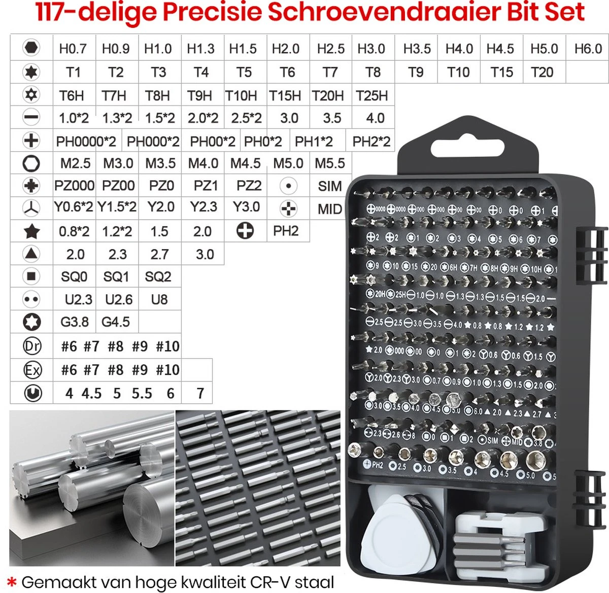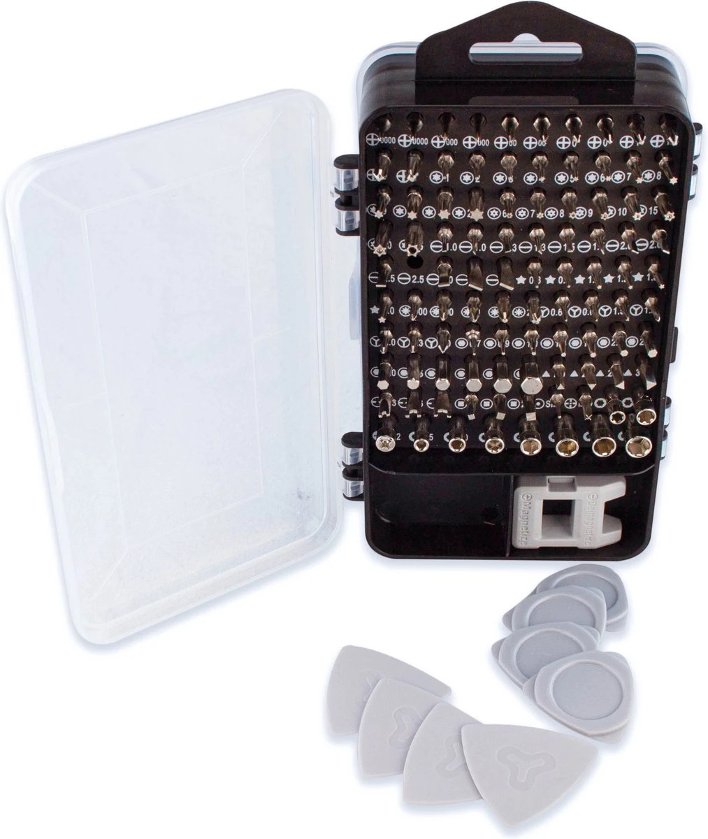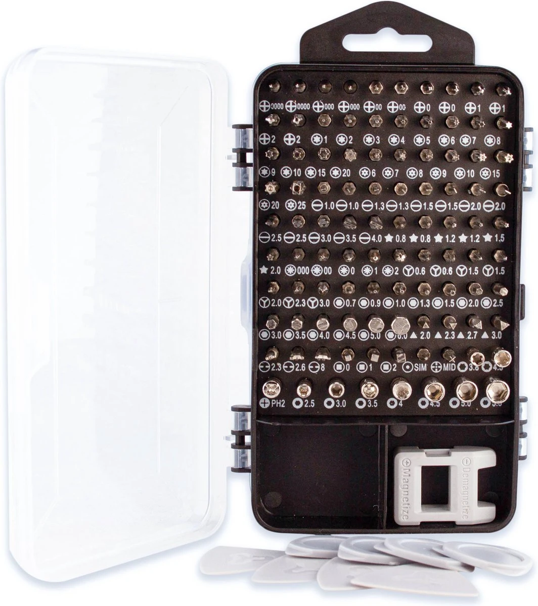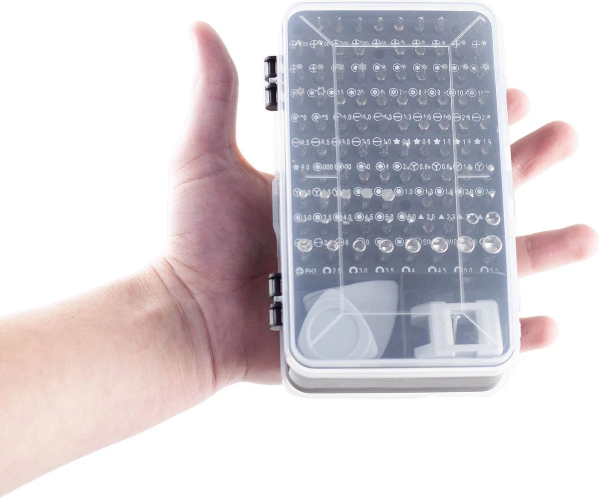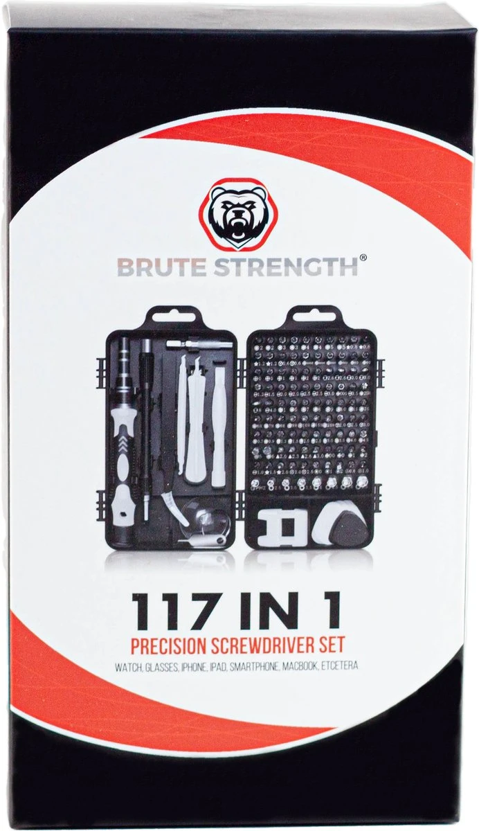 Alles wat je nodig hebt in 1 volledige set! Deze 117-delige precisie schroevendraaier set van het merk Brute Strength ® is perfect voor bijvoorbeeld het repareren van iPhone/ Xiaomi/Samsung telefoons én gameconsoles. Ook de reparatie en demontage van huishoudelijke apparaten zoals tv’s, laptops, camera’s, airconditioners, ventilatoren en koelkasten zijn een fluitje van een cent met deze set!