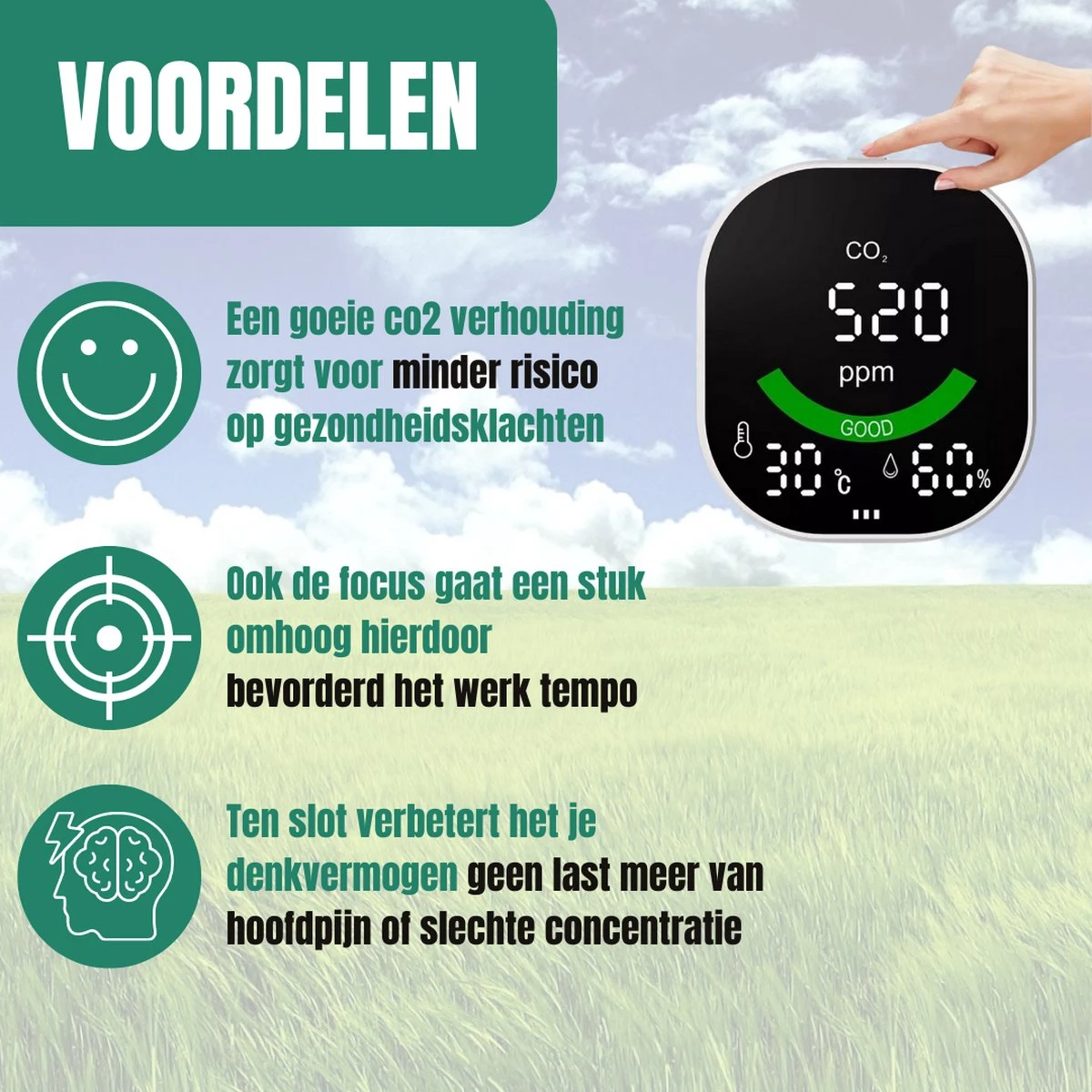 3 in 1 meter: Onze co2 meters zijn multifunctioneel uitgerust en hebben 3 functies in 1. Buiten het met van co2, meet het ook de huidige temperatuur in huis en ook de vochtigheid. Zo kun je in een oogopslag zien hoe de kwaliteit is van jou woon of werkomgeving.