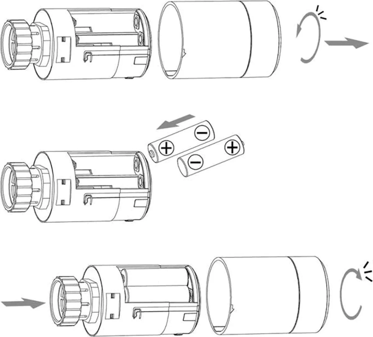 2. Draai het kapje van de slimme radiatorkraan en doe 2 AA batterijen in de houders. Draai vervolgens het kapje weer op de radiatorkraan. Zorg dat de batterijen op de aangegeven manier zijn geinstalleerd. Het display zal nu oplichten. Let op: de AA batterijen zijn niet meegeleverd.