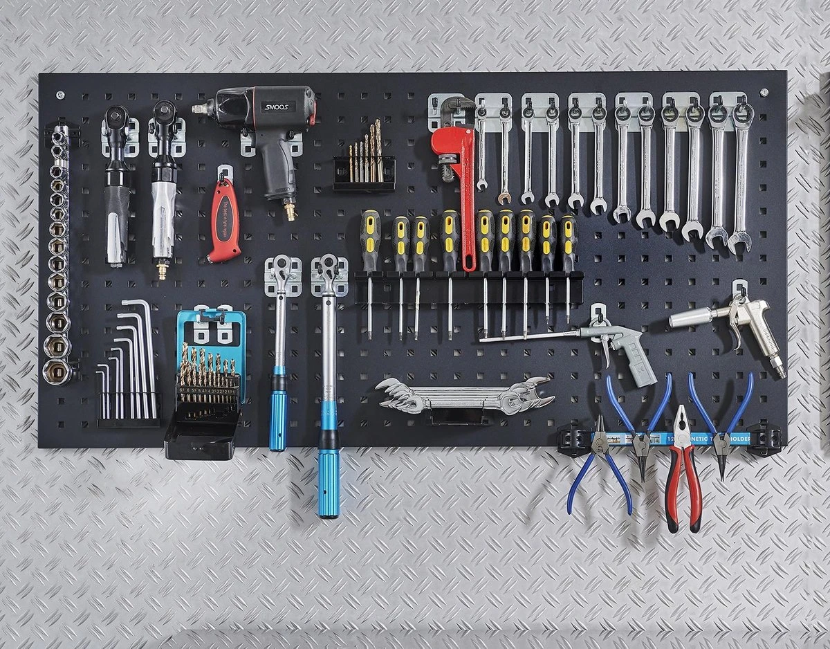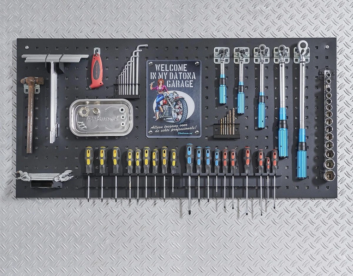 De manier om al jouw speciaalgereedschap in één oogopslag te ordenen. Dit metalen hangbord is eenvoudig te monteren achter een werkbank of gewoon aan de muur. Met het ruime assortiment van Datona gereedschapshaken kunt u elk stukje gereedschap stevig en overzichtelijk opbergen aan deze wandplaat. Niet alleen voor werkplaatsen of hobbyruimtes is dit gatenbord onmisbaar, maar ook een “must” als een onderdeel van jouw bedrijfswagen inrichting. De afmetingen van de gaten is 10,5 x 10,5 mm (R38), de ruimte die tussen de gaten zit is 25 mm. De afmetingen van dit gereedschaprek is 122 x 61 cm en is afgewerkt met een krasvaste poedercoating zodat het gereedschap bord ook mooi blijft.