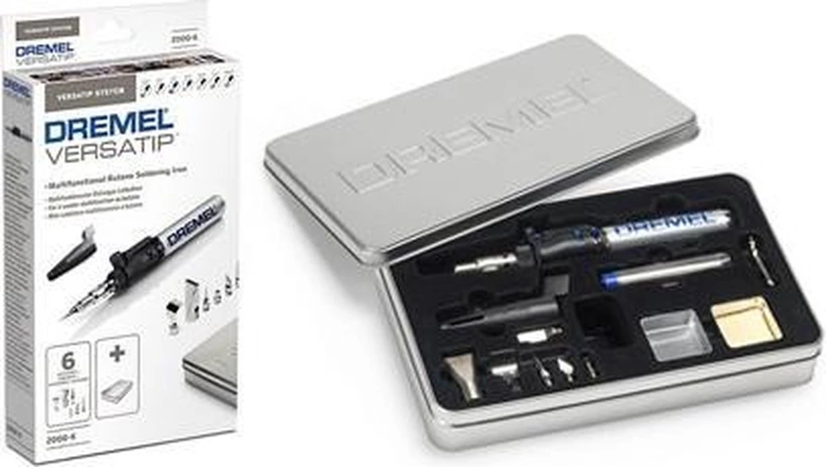 De snoerloze 6-in-1 gassoldeerbout van Dremel. Het perfecte gereedschap voor solderen, smelten, krimpen, pyrografie, warm snijden en verf verwijderen. De enige soldeerbout die een groot aantal toepassingen in één gereedschap verenigt, dankzij het vermogen om 6 verwisselbare tips te gebruiken.