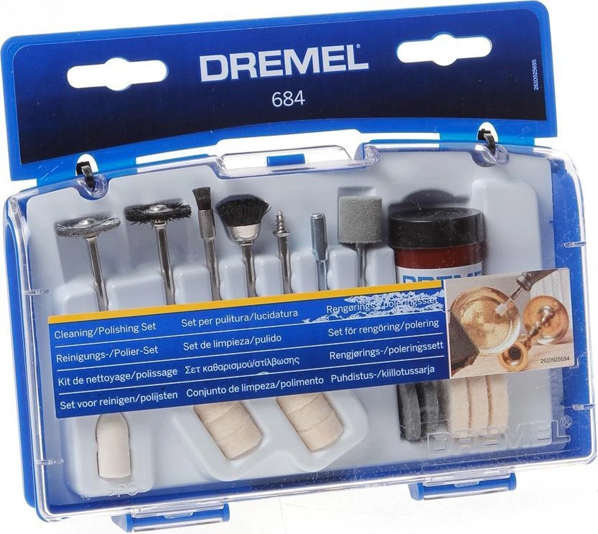 De Dremel 684 accessoireset heeft alles wat je nodig hebt om je werkstuk te reinigen en te polijsten. De handige doos bestaat uit een uitneembaar accessoirebakje en de 3 verdelers zorgen voor een perfecte opbergoplossing. Het Dremel Quick Start boekje geeft een beschrijving van de meegeleverde accessoires.