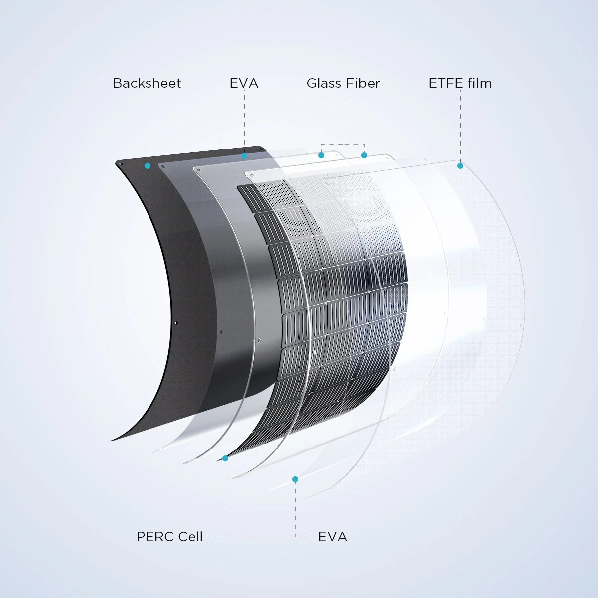 Gebouwd om de storm te doorstaan. Ons 100W flexibele zonnepaneel kan zelfs in de zwaarste regen zonne-energie opvangen. Met een beschermende ETFE-film zijn de zonnecellen van het paneel bestand tegen vele omgevingen, van vochtig tot droog.