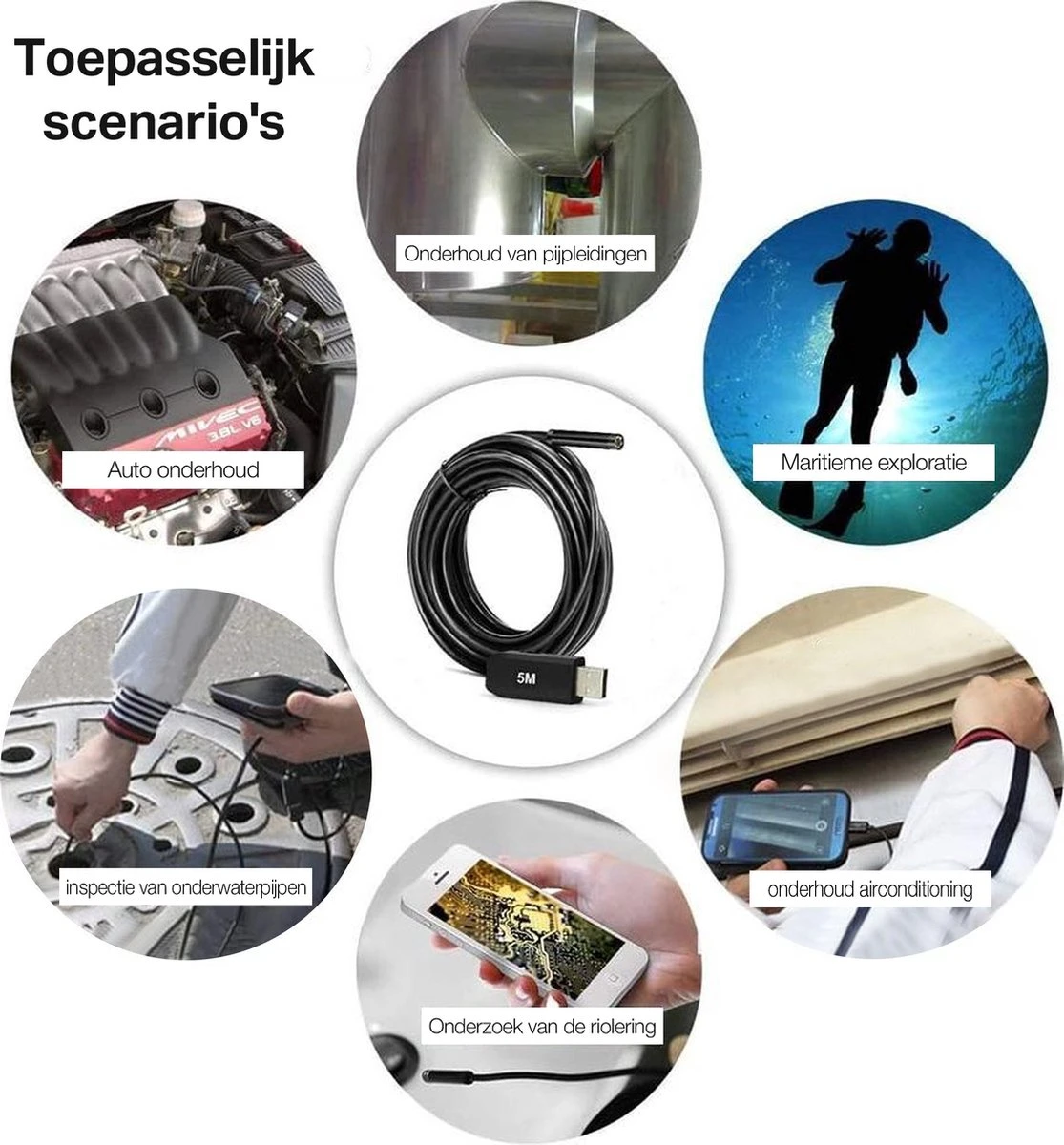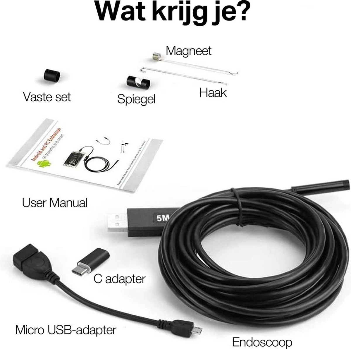 Dit is een waterdichte USB-endoscoop, 2 in 1 Borescope Inspection HD Handy Flexible Camera. met verstelbare 6 led-verlichting en 5M USB-kabel met slang.