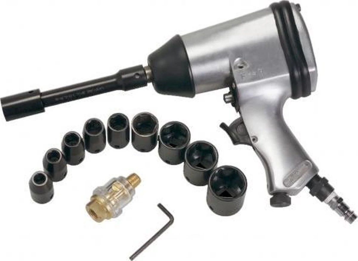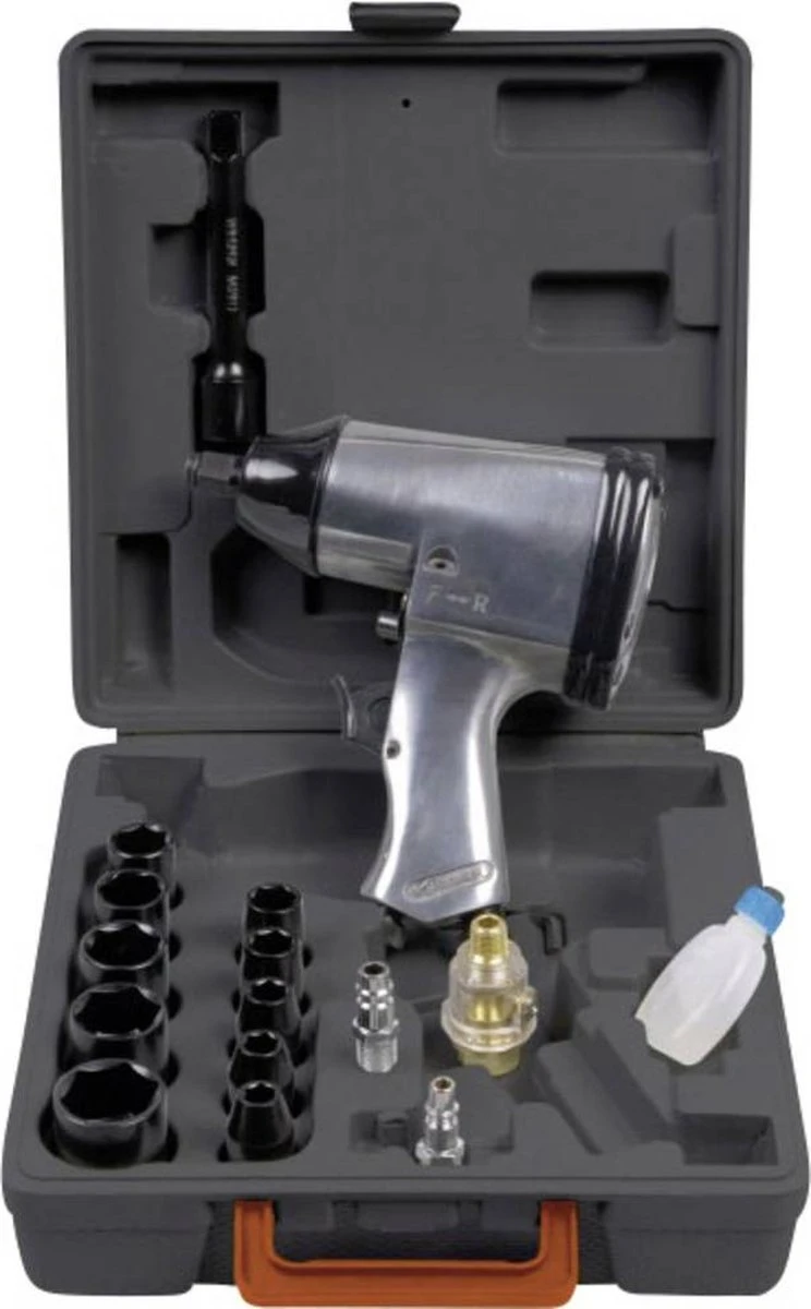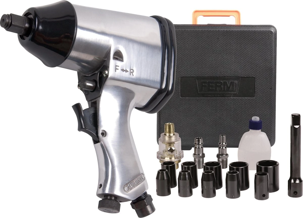 Met de FERM ATM1043 slagmoersleutel aangesloten op je compressor, draai je bouten en moeren zonder problemen vast en ook weer los. De sleutel wordt compleet met een 10-delige doppenset en een handige draagkoffer geleverd.