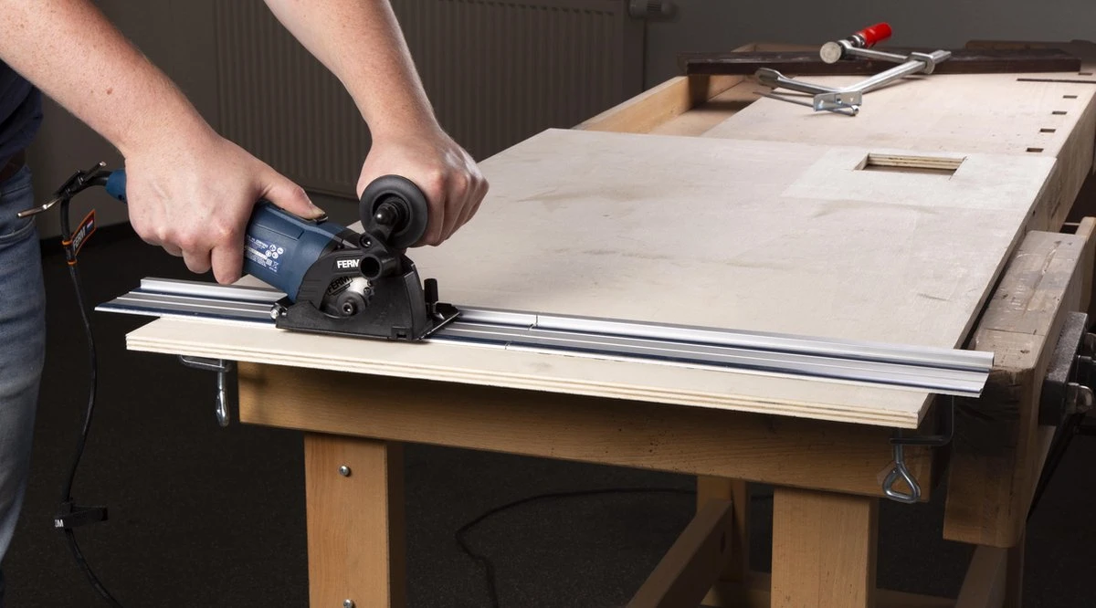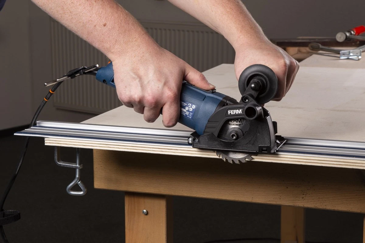 Met deze krachtige en compacte FERM 500W precisie cirkelzaag is geen klus te gek! De machine wordt geleverd met een set van twee geleiderails met een totale lengte van 700mm. Zaag door vrijwel ieder materiaal met de drie meegeleverde zaagbladen met een diameter van 85mm en de variabel instelbare snelheid. De zaagdiepte van de machine is eenvoudig instelbaar tot 22mm. Dankzij de meegeleverde stofafzuiging met adapter kun je stofvrij aan het werk.