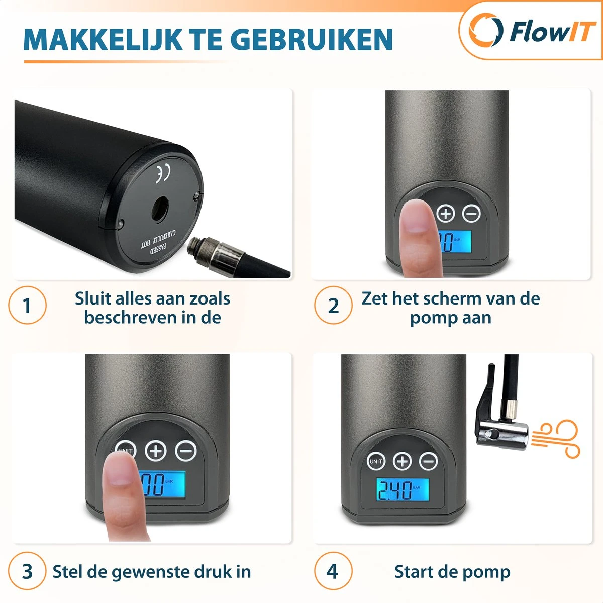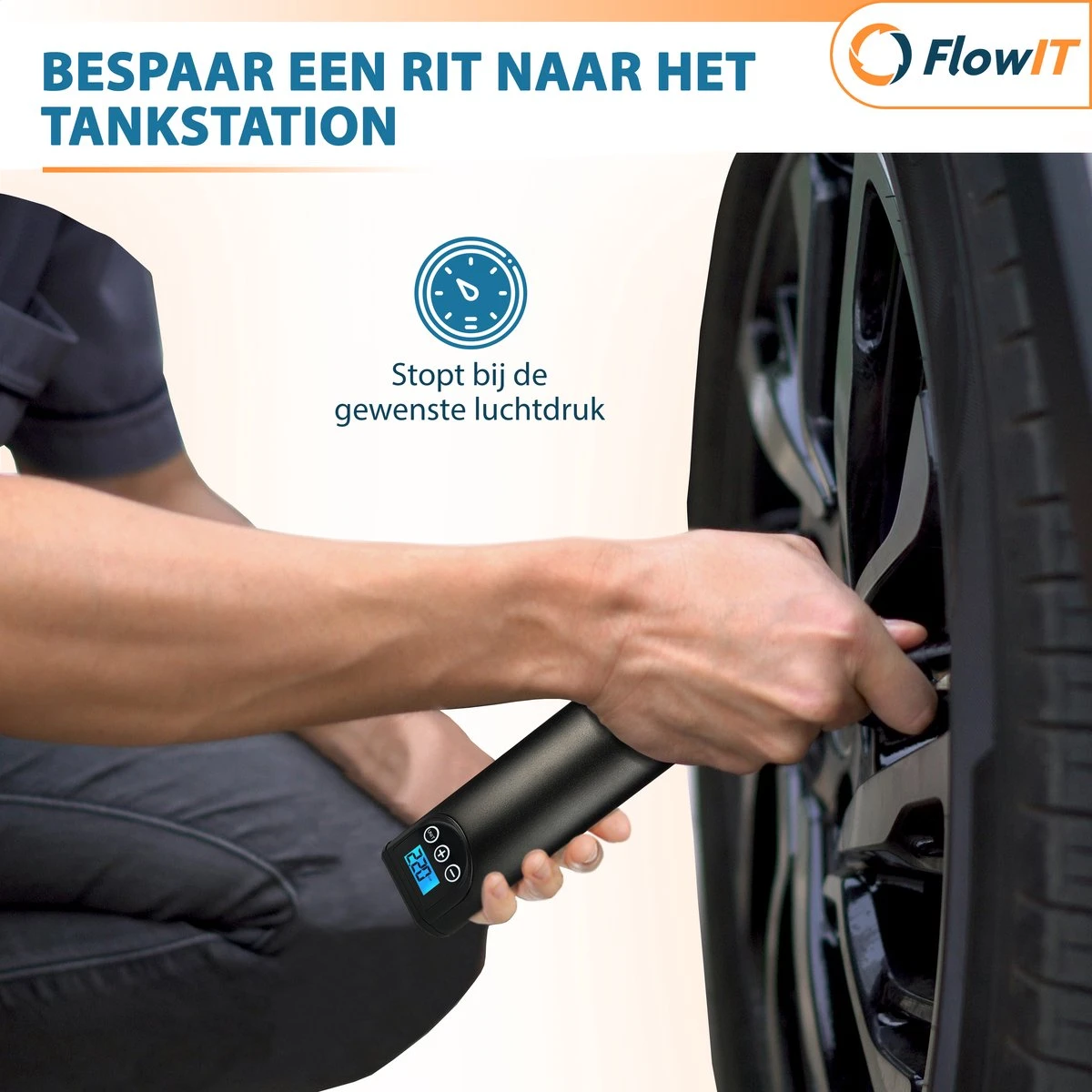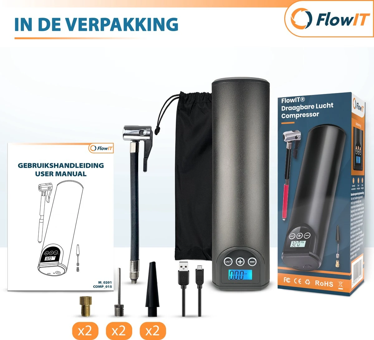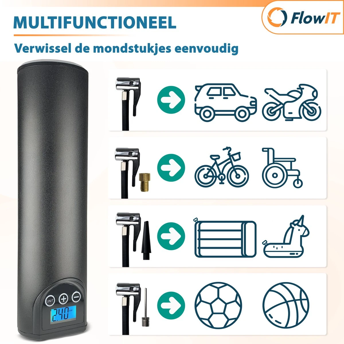 FlowIT Draagbare Compressor Bandenpomp – Elektrische Fietspomp – Luchtcompressor Oplaadbaar – Fiets Tot Auto