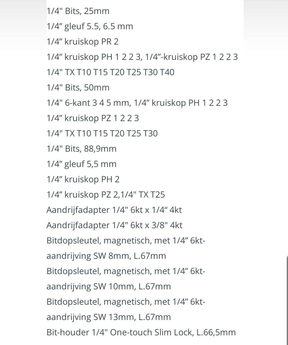 - 1/4 plat 5,5 mm, 1/4 kruiskop PH 2, 1/4 bits, 25 mm, 1/4 plat 5.5, 6,5 mm, 1/4 kruiskop PR 2, 1/4 kruiskop PH 1 2 2 3, 1/4 kruiskop PZ 1 2 2 3, 1/4 TX T10 T15 T20 T25 T30 T40, 1/4 bits, 50 mm, 1/4 6-kant 3 4 5 mm, 1/4 kruiskop PH 1 2 2 3, 1/4 kruiskop PZ 1 2 2 3, 1/4 TX T10 T15 T20 T25 T30, 1/4 bits, 88,9mm, 1/4 kruiskop PZ 2, 1/4 TX T25, Aandrijfadapter 1/4 6-kant x 1/4 4-kant, l. 50 mm, Aandrijfadapter 1/4 6-kant x 3/8 4-kant, l. 50 mm, Steeksleutelinzet, magnetisch, met 1/4 6-kantige aandrijving SW 8 mm, L.67 mm, Steeksleutelinzet, magnetisch, met 1/4 6-kantige aandrijving SW 10 mm, L.67 mm, Steeksleutelinzet, magnetisch, met 1/4 6-kantige aandrijving SW 13 mm, L.67 mm, Bithouder 1/4 One-touch Slim Lock, L.66,5mm