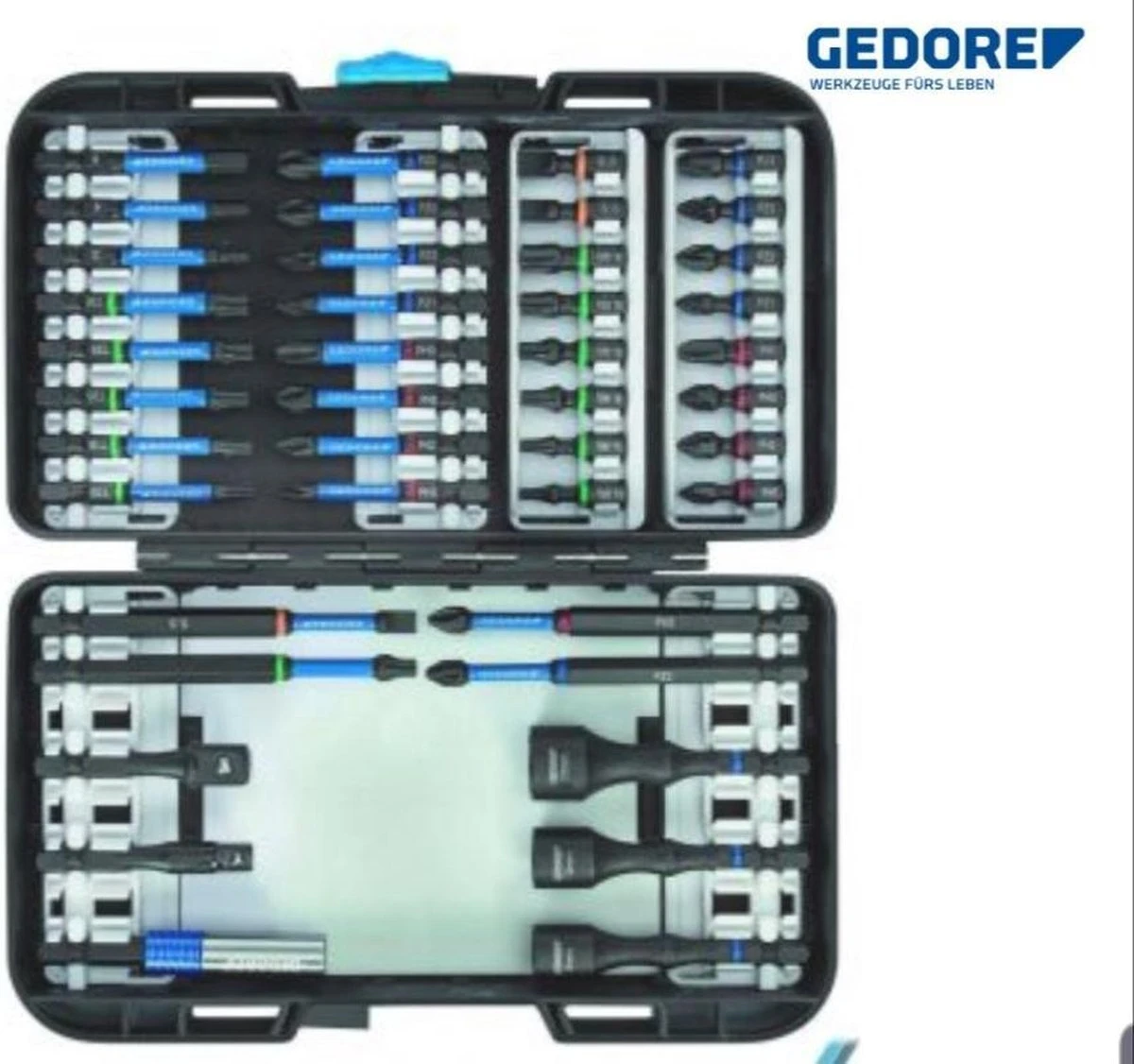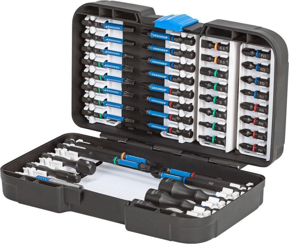 Torsiebit-set – 42-delig Torsiezone ter bescherming van de bits onder belasting, koppelpieken worden zacht opgevangen en zo de levensduur wordt verhoogd Incl. Extreem slanke, zelfborgende magneetbithouder met snelwisselfunctie Voor zachte en harde schroefgevallen Geschikt voor gebruik in slagschroevendraaiers Extreem sterke magneet De teksten voor dit artikel zijn automatisch vertaald. Technische spec.: Afmeting, breedte: 120 mm · Afmeting, hoogte: 45 mm · Afmeting, lengte: 190 mm · Gewicht: 670 g · Soortnaam: Bitset Omvang levering: 1/4″ bits, 25 mm, 1/4″ plat 5.5, 6,5 mm, 1/4″ kruiskop PR 2, 1/4″ kruiskop PH 1 2 2 3, 1/4″ kruiskop PZ 1 2 2 3, 1/4″ TX T10 T15 T20 T25 T30 T40, 1/4″ bits, 50 mm, 1/4″ 6-kant 3 4 5 mm, 1/4″ kruiskop PH 1 2 2 3, 1/4″ kruiskop PZ 1 2 2 3, 1/4″ TX T10 T15 T20 T25 T30, 1/4″ bits, 88,9mm, 1/4″ plat 5,5 mm, 1/4″ kruiskop PH 2, 1/4″ kruiskop PZ 2, 1/4″ TX T25, Aandrijfadapter 1/4″ 6-kant x 1/4″ 4-kant, l. 50 mm, Aandrijfadapter 1/4″ 6-kant x 3/8″ 4-kant, l. 50 mm, Steeksleutelinzet, magnetisch, met 1/4″ 6-kantige aandrijving SW 8 mm, L.67 mm, Steeksleutelinzet, magnetisch, met 1/4″ 6-kantige aandrijving SW 10 mm, L.67 mm, Steeksleutelinzet, magnetisch, met 1/4″ 6-kantige aandrijving SW 13 mm, L.67 mm, Bithouder 1/4″ One-touch Slim Lock, L.66,5mm