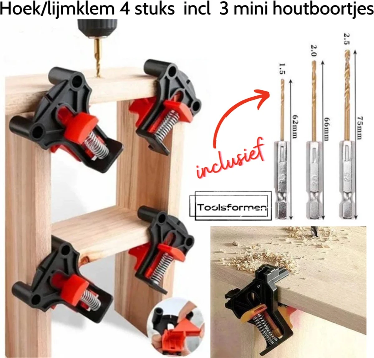 De HoekklemKit is een welkome hand tijdens het werk. Door je planken stevig bij elkaar te houden tijdens het schroeven, lijmen of boren vergemakkelijk je het werk en je werkt sneller, effectiever, en productiever en je Bespaart tijd en energie tijdens uw project. De Toolsformen hoekklemset houd uw planken perfect uitgelijnd elke keer weer met deze Hoekklemset!