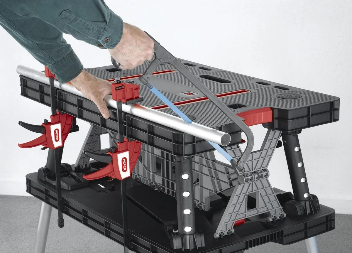 Deze Keter Inklapbare Werktafel is nog altijd populair. Een zeer veelzijdige werktafel is nu voorzien van extra functies. Hij heeft nog steeds een lichtgewicht frame zodat je hem gemakkelijk kunt opvouwen en dragen, en hij is stevig genoeg om een lading van 450 kg te dragen. Daarnaast is de tafel uitgerust met en knevel- en houdklemmen, zodat die balk die je wilt zagen stevig op de tafel blijft liggen! Het heeft een uniek opvouwbaar systeem waardoor het snel en eenvoudig is op te zetten en in te pakken. Kortom, de ideale basis voor elke klus!