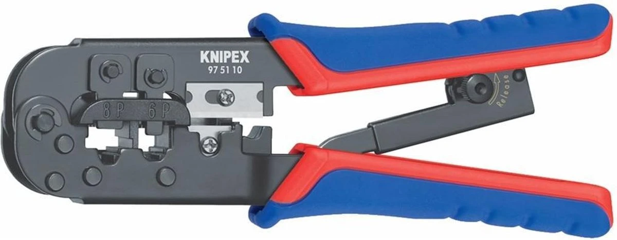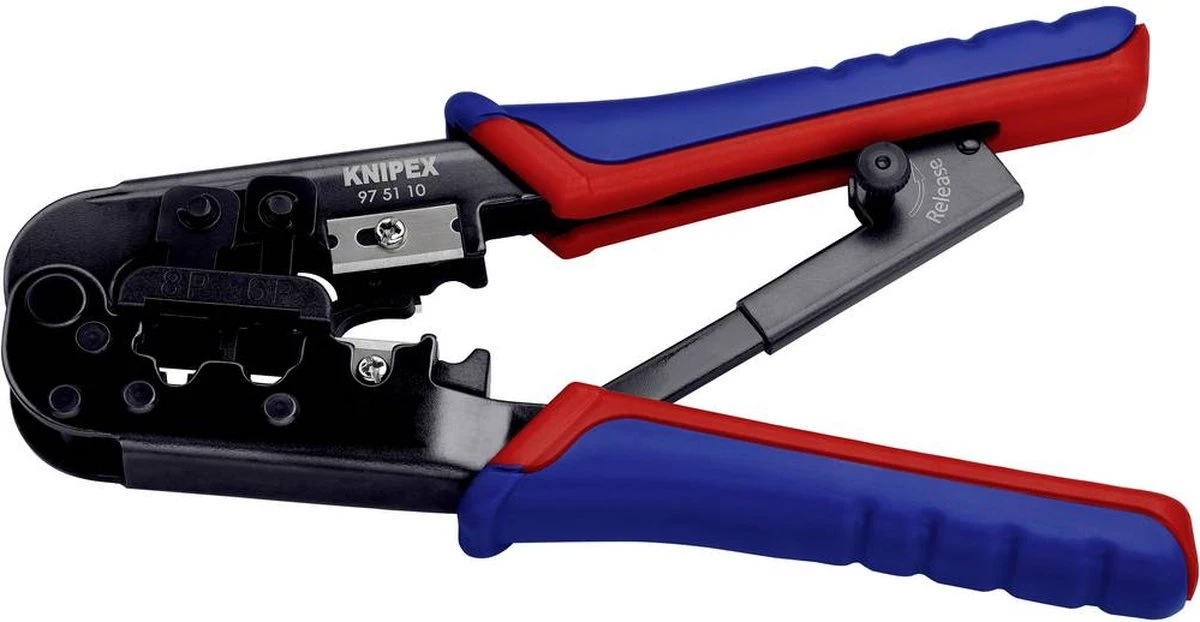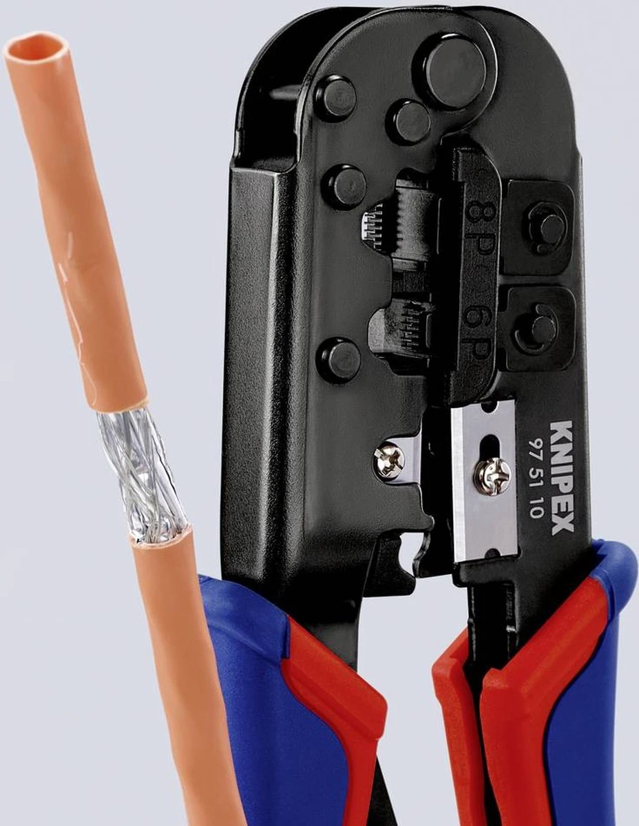 - Voor het krimpen van 6- en 8-polige western-stekkers van het type RJ 11/12 (9,65 mm breed) en type RJ 45 (11,68 mm breed)