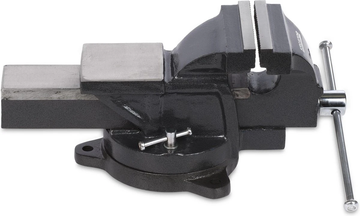 De sterke gietijzeren bankschroef van 14,5 kg heeft een maximale spanbreedte van maar liefst 150 mm tussen de klemmen.