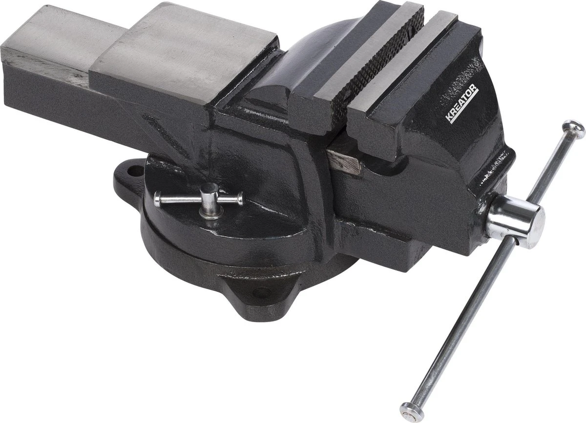 Voor extra stabiliteit kan je de basis van de bankschroef op je werkbank bevestigen. De bankschroef zelf kan 360° draaien zodat je gemakkelijk de juiste positie vindt om vlot te werken, maar je kan hem evengoed ook stevig vastzetten zodat hij niet meer draait.