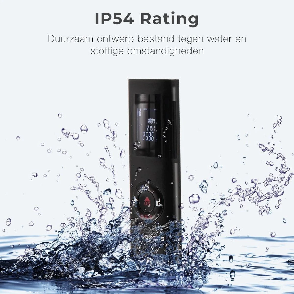 Een verbouwing is stoffig en soms zul je buiten staan in de regen. De LifeGoods laser afstandsmeter heeft een IP54 rating. Dat houdt in dat stof en een klein beetje water geen enkel probleem is!