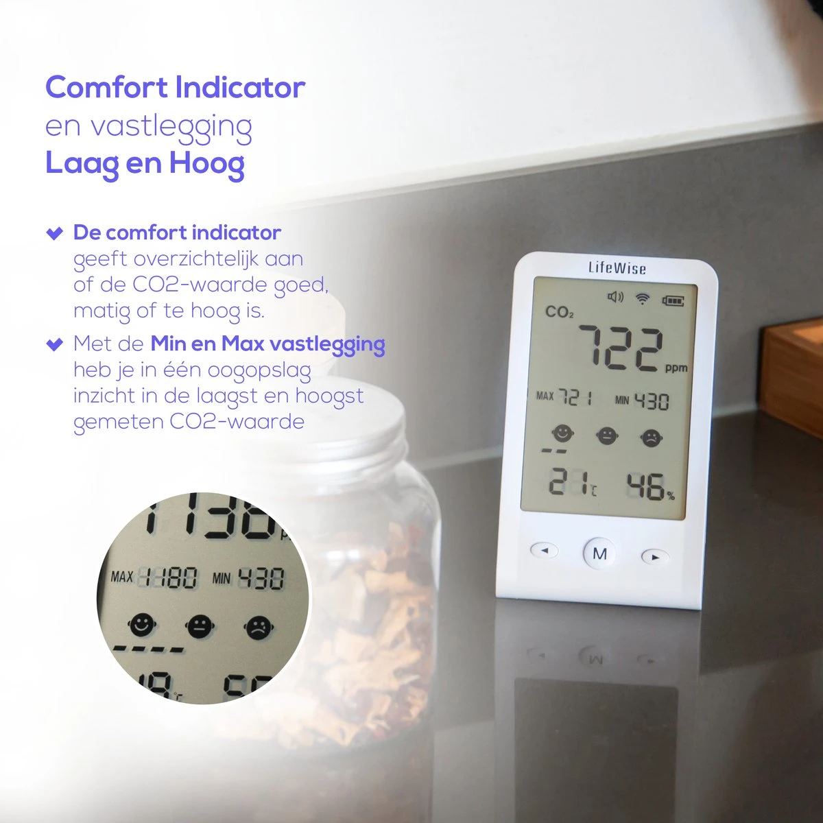 De CO2-meter van LifeWise is veelzijdig en intelligent. Dankzij de uiterst gevoelige NDIR-sensor geeft de luchtkwaliteitsmeter de CO2-waarde tot op 1ppm nauwkeurigheid aan. De comfort indicator geeft overzichtelijk aan of de CO2-waarde goed, matig of te hoog is. Aansluitend wordt de laagst en hoogst gemeten CO2-waarde vastgelegd zodat je een optimaal inzicht in de CO2-waarde hebt.