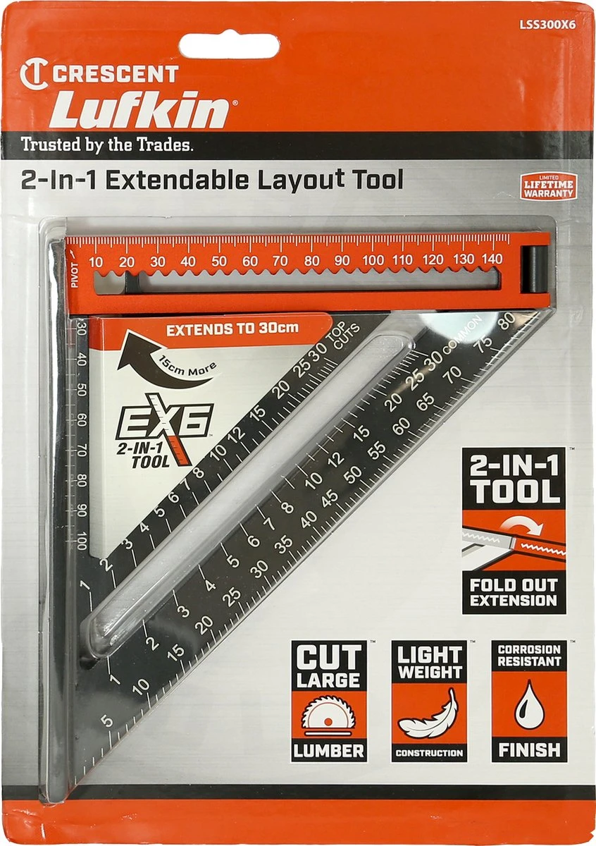 De Lufkin 2-in-1 uitschuifbare lay-out tool & Speed Square (LSS300X6EU) heeft 2-in-1-mogelijkheden die houtbewerking sneller en gemakkelijker maken. Lufkin’s winkelhaak is ideaal voor zowel de professional als de doe-het-zelver, die de klus koste wat het kost wil klaren. Uitgerust om in elke omgeving te presteren, kunt u met deze winkelhaak gemakkelijk meerdere taken uitvoeren met de geavanceerde ontwerpkenmerken die duurzaamheid en maximale functionaliteit bieden.