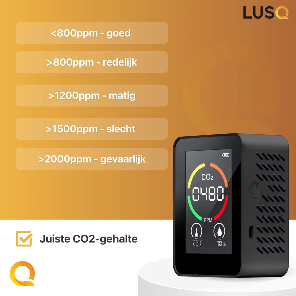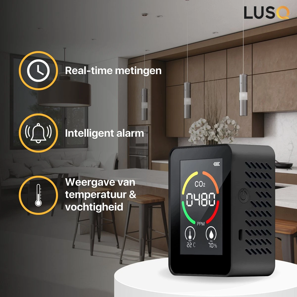 Met de CO2 meter, melder en monitor inclusief thermometer van LUSQ kunt u direct de kwaliteit van de lucht meten en tevens ook zien wanneer de omgeving effect kan hebben op jouw gezondheid. Verschijnselen zoals hoofdpijn, duizeligheid en vermoeidheid ontstaan vaak door een te hoog CO2-gehalte. Bescherm jezelf, je familie en medemens met een van de luchtkwaliteitsmeters van LUSQ. Ontdek meer over de compacte en oplaadbare CO2 meter!