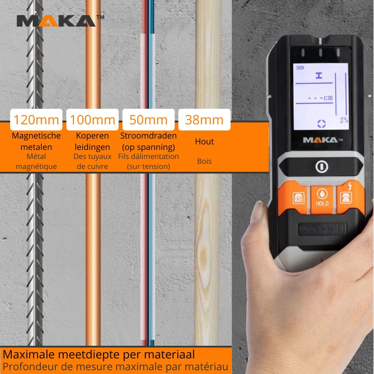 ✓ Detecteert zowel metaal, leidingen, stroomdraden en hout