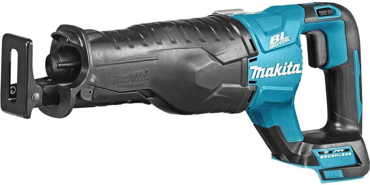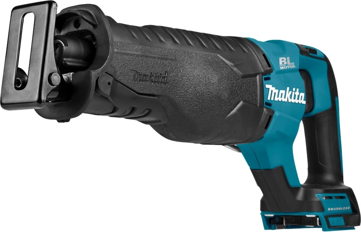 Accu reciprozaag. Sterk staaltje innovatie. Rustig en zuiver zagen met het nieuwe krukasmechanisme, het nieuw ontworpen krukmechanisme minimaliseert de trillingen. Dit is niet alleen prettiger werken, maar zorgt er ook voor dat het zaagblad minder vibreert. Constanter zagen dankzij koolborstelloze motor. Door de vormgeving van het nieuwe krukmechanisme gaat de achterwaartse beweging sneller. Dat komt omdat de achterwaartse hoek kleiner is. Hierdoor zaagt de reciprozaag sneller. De DJR187 biedt een extra voordeel. Doordat dit model is voorzien van een koolborstelloze motor is het toerental veel constanter in vergelijk met de DJR181 en zijn 2-polige motor. Twee elektronische toerentallen. De DJR187 is voorzien van twee instelbare elektronische toerentallen. Het hoge toerental is zeer geschikt voor hout en het lage toerental voor metaal. * Zonder accu”s en lader, en zonder kist * Compacte, energiezuinige en zeer snelle accu reciprozaag. * Zaagt rustig en zuiver dankzij het nieuwe krukmechanisme. * Voorzien van twee instelbare toerentallen afgestemd op hout en metaal. * Extra verstevigde aanslag en met snelklem gemakkelijk te verstellen. * Zaagt sneller dankzij de vormgeving van het nieuwe krukmechanisme. * Makkelijke eenhandszaagwissel: middels kliksysteem en zonder gereedschap. * Beter beschermd tegen het binnendringen van stof en vocht. * Standaard uitgerust met een draaghaak om de machine gemakkelijk aan bijvoorbeeld een steigerbuis op te hangen.Makita DJR187Z 18 V Reciprozaag