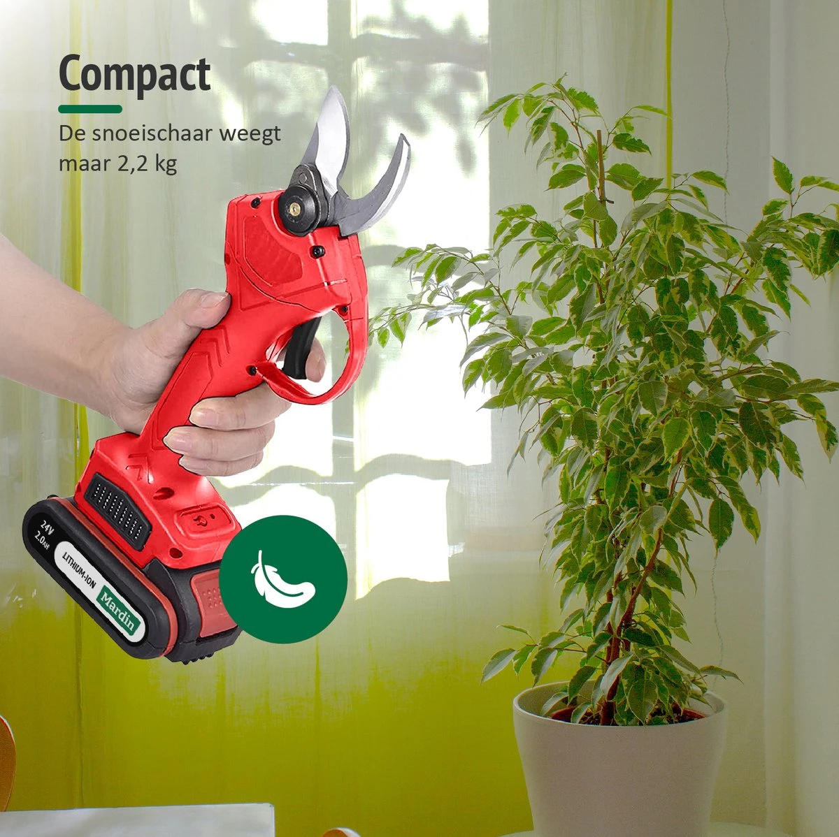 De Mardin® Snoeischaar – SS-1 is een krachtige elektrische snoeizaag die volledig draadloos is. De schaar wordt geleverd met een GRATIS extra accu, een opbergkoffer en met een flesje onderhoudsolie. De snoeizaag ligt lekker in de hand en heeft dan ook de perfecte grip om moeiteloos jouw planten en bomen bij te snoeien. Ideaal!