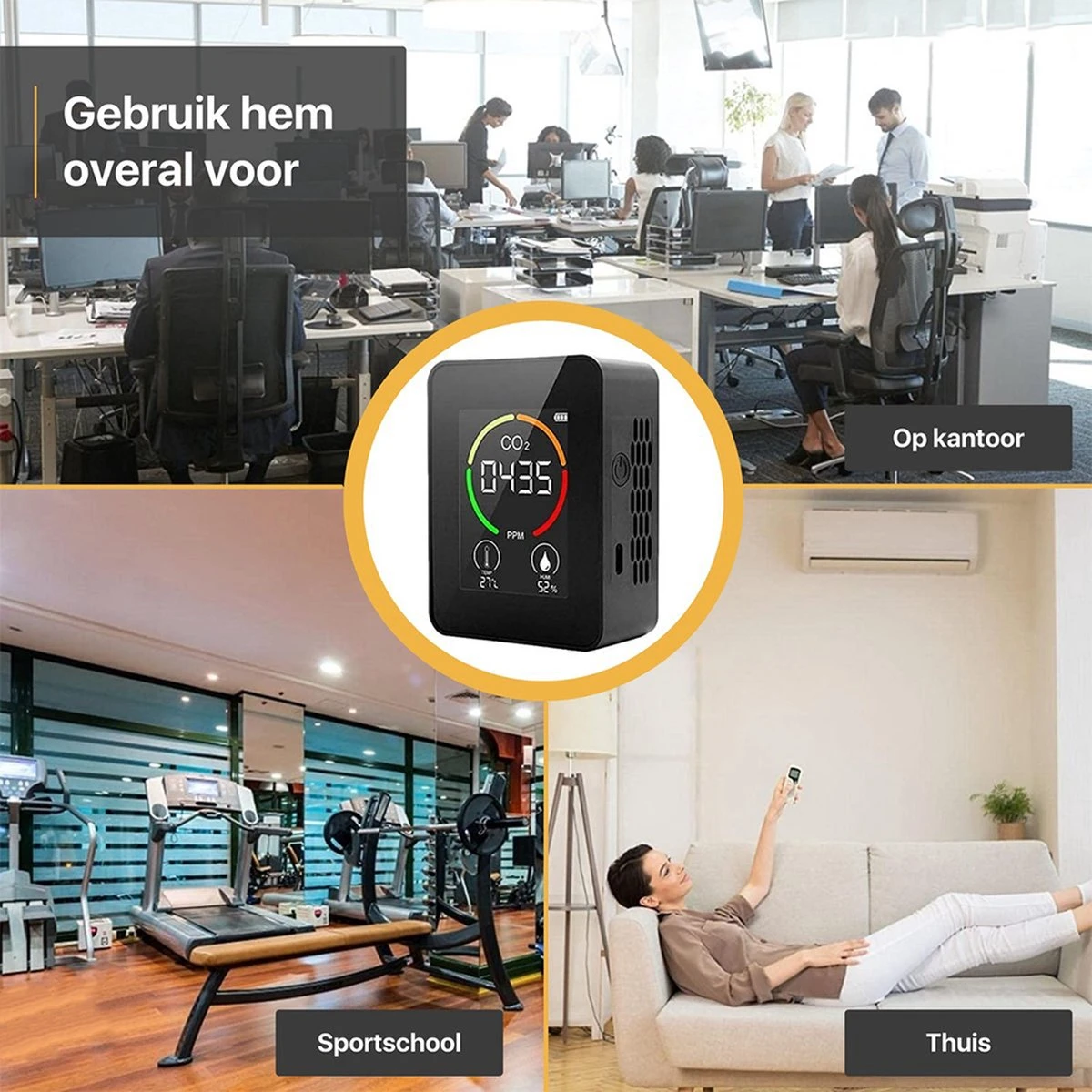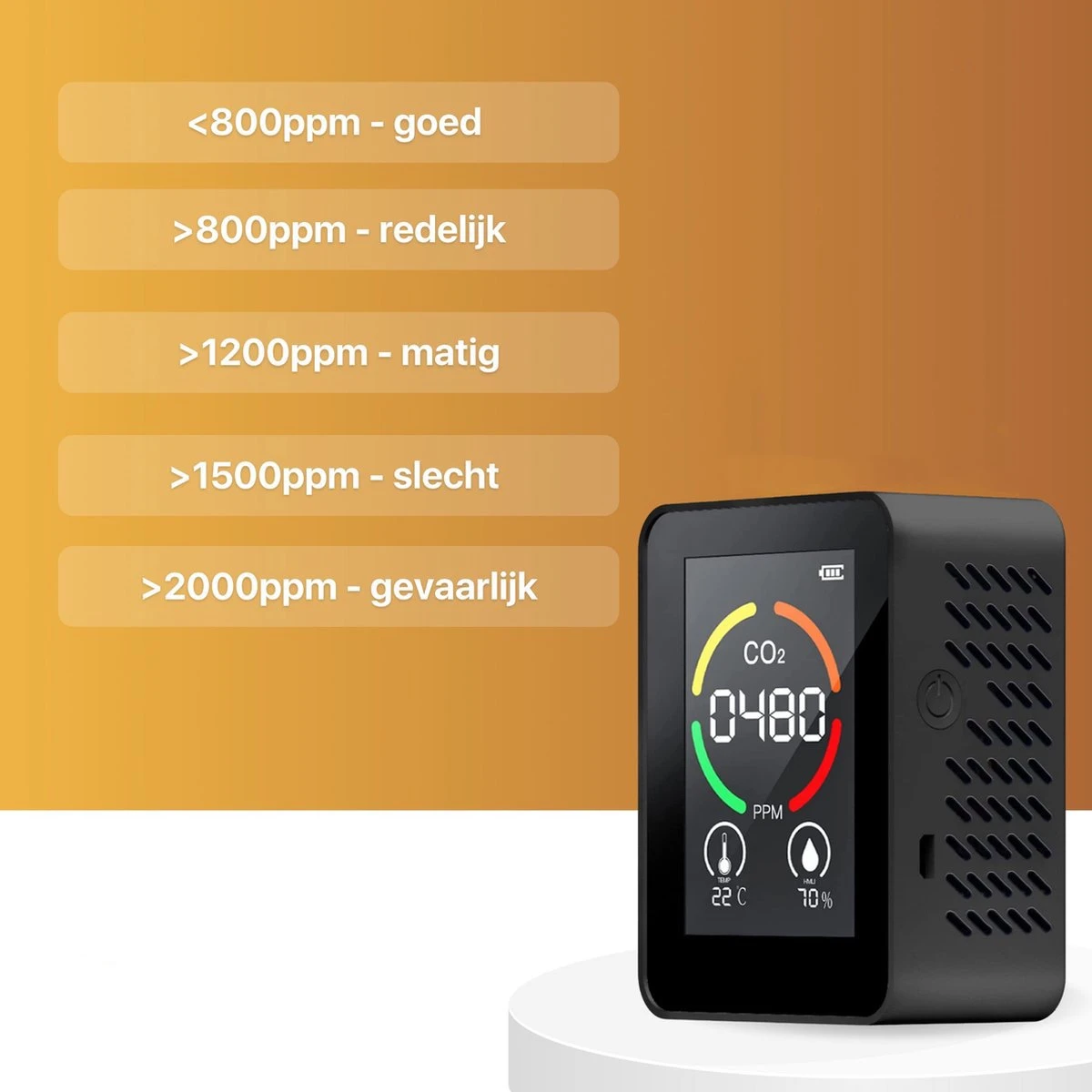 Het is van groot belang om te weten hoe het gesteld staat met de luchtkwaliteit in je huis of bijvoorbeeld op kantoor. Een goede luchtkwaliteit is namelijk belangrijk en werkt mee aan een goede gezondheid. Deze praktische en compacte CO2 meter meet niet alleen het CO2 gehalte, maar ook de temperatuur en de luchtvochtigheid. Deze waarden zijn gemakkelijk af te lezen van het grote LCD scherm. Je kunt ten alle tijden de real-time metingen bekijken. De meter heeft een intelligent alarm die af zal gaan als het CO2 gehalte in de ruimte te hoog is. Zo weet je altijd wanneer je de ruimte even moet ventileren.