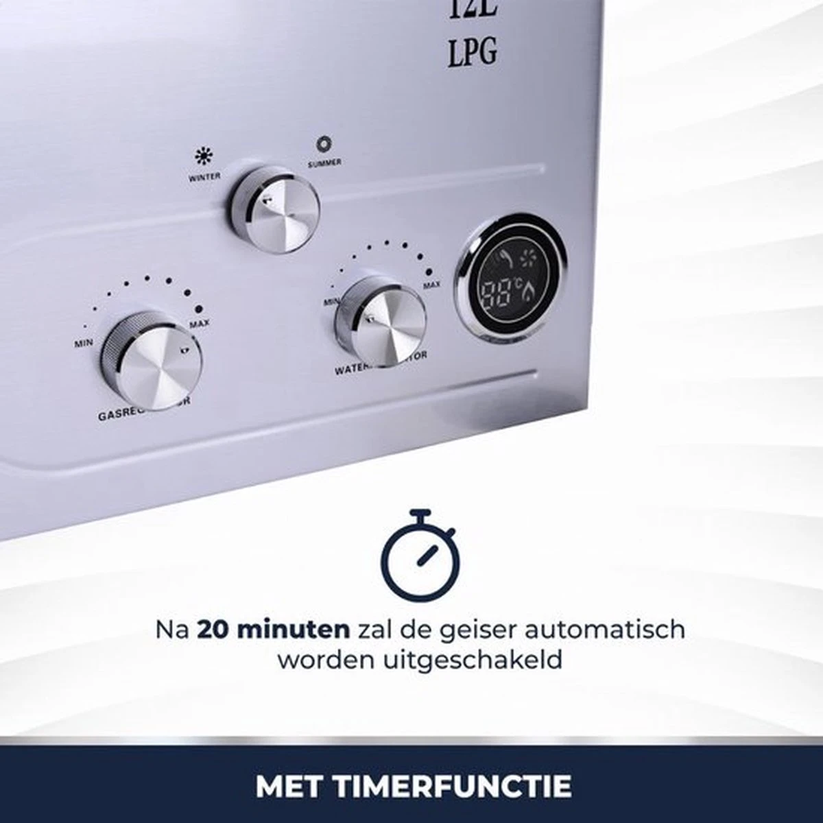 ✅ Met timer – Na 20 minuten zal de geiser automatisch worden uitgeschakeld.