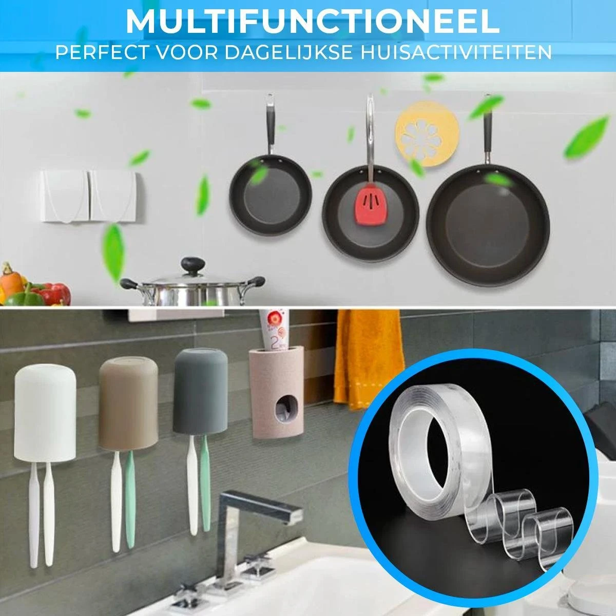 Onze nano tape staat ook wel bekend als ‘magic tape’. Deze maakt namelijk gebruik van zogenaamde nano technologie wat (o.a.) zorgt voor een extra sterke tape. De tape is 3 meter lang en transparant, herbruikbaar, afwasbaar, waterproof, rekbaar, megasterk, dubbelzijdig en laat ook nog eens geen sporen achter!