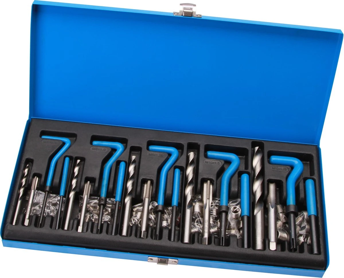 Schroefdraadreparatieset voor het repareren van beschadigde inwendige schroefdraad.