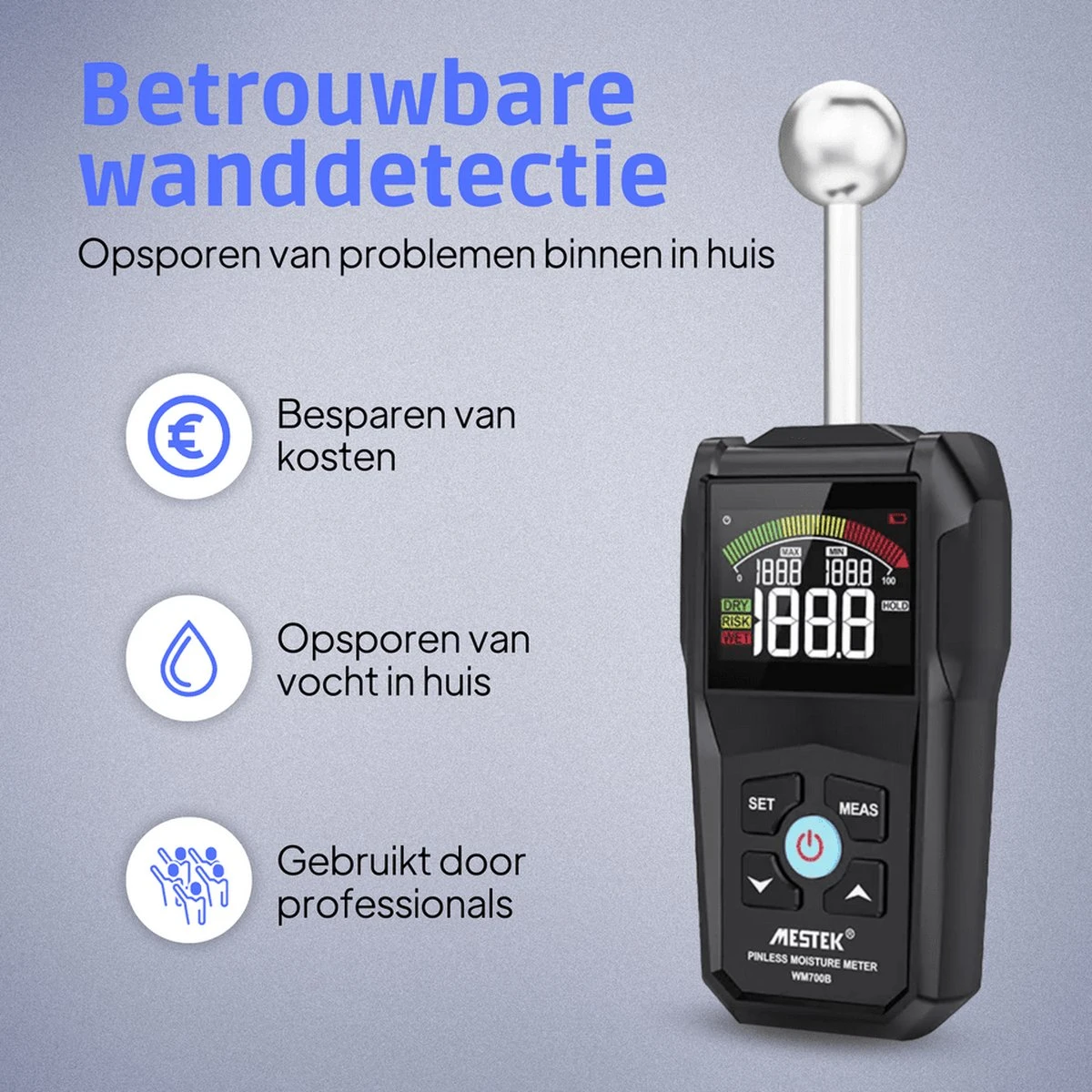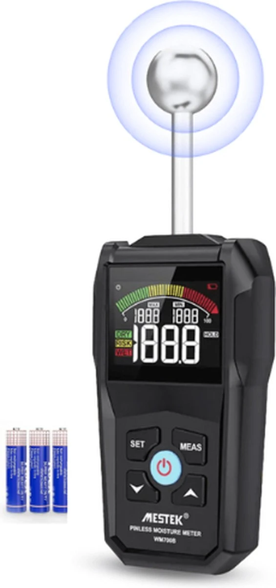 kennis met de Mestek vochtmeter WM700B. De hygrometer beschikt over zeer nauwkeurige sensoren waardoor jij binnen 0,5 seconden al een nauwkeurige meting hebt. Met een gewicht van slechts 400 gram, en een meegeleverde opbergtas neem jij de vochtmeter overal mee naartoe!
