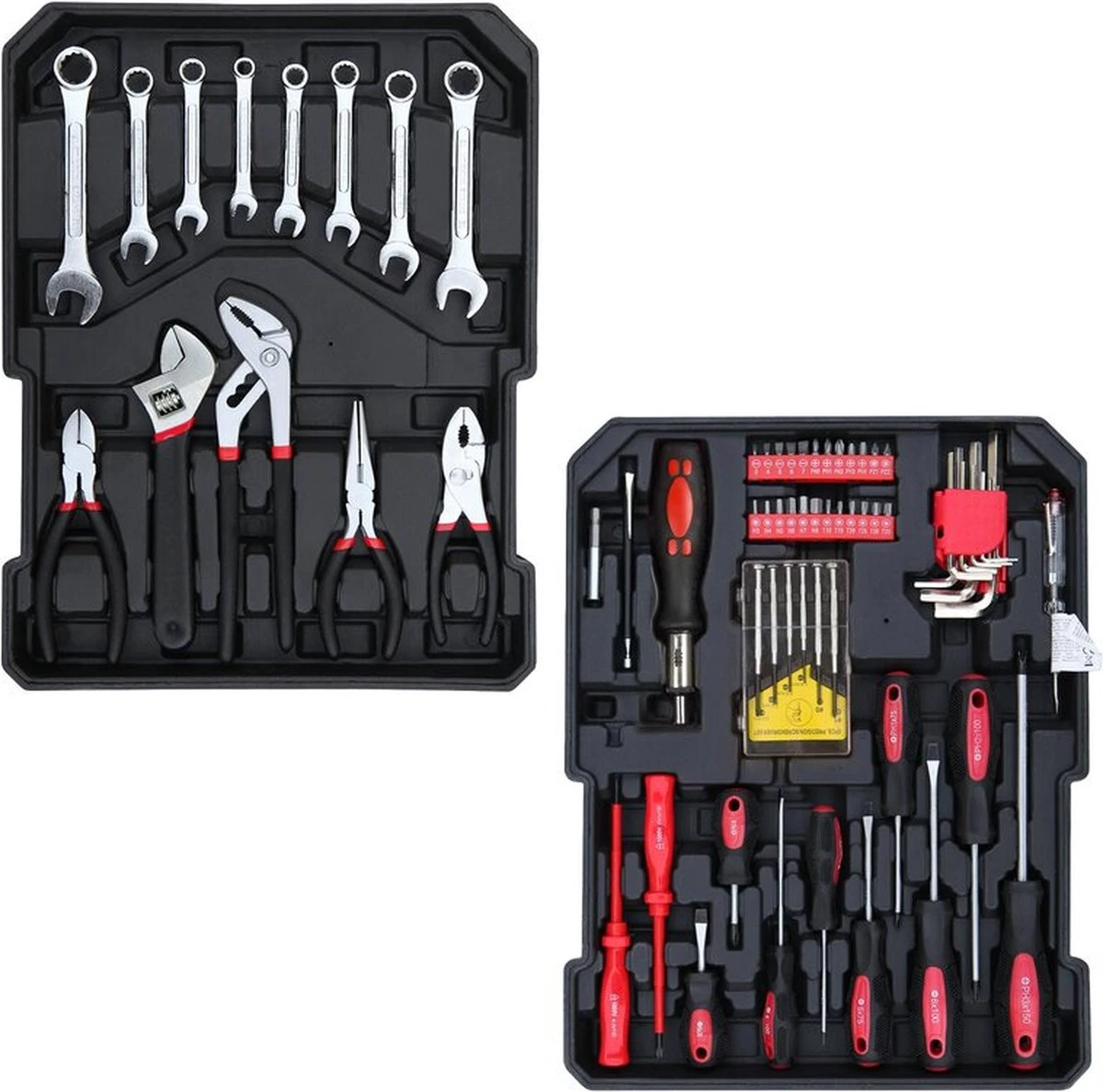 Zeer uitgebreide gereedschapsset van hoogwaardige kwaliteit staal Chroom-vanadiumstaal in aluminium trolley met wieltjes. In de koffer is veel gereedschap ruimtebesparend ondergebracht in vierniveaus. De koffer is voorzien van wieltjes en een telescoop handvat, zodat deze gemakkelijk kan worden verplaatst. Ons gereedschap is uitermate geschikt voor alle dagelijkse klussen in huis en door de handige trolley met wieltjes, neem je hem eenvoudig mee naar een klus.