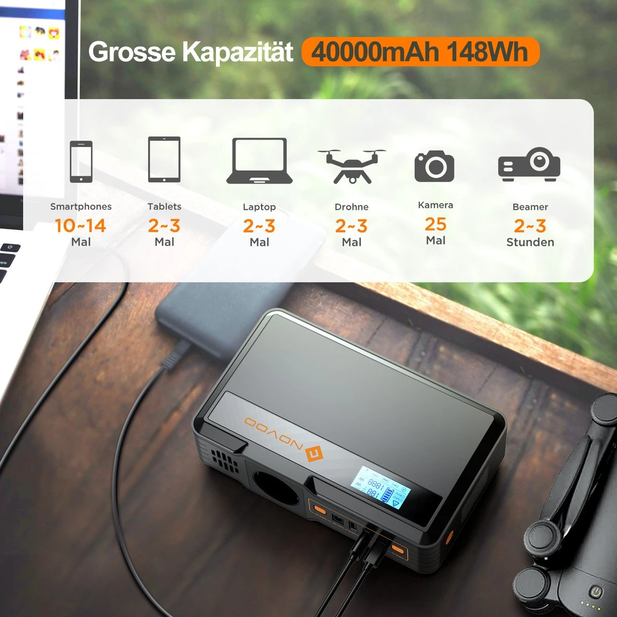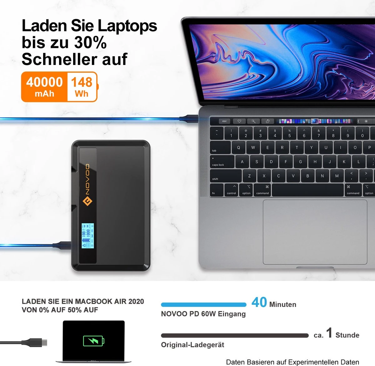 Draagbare batterij voor optimaal gebruik met laptop. 40000mAh/148Wh/100W mobiele voeding, krachtig genoeg om MacBook Pro 13 meer dan 2 keer op te laden, of iPhone 11 10 keer op te laden. Het kan aan uw behoeften voldoen tijdens buitenreizen, kamperen, sporten en andere activiteiten met een compact formaat van 8,3 * 5,2 * 2,3 inch en een gewicht van 3 lbs.