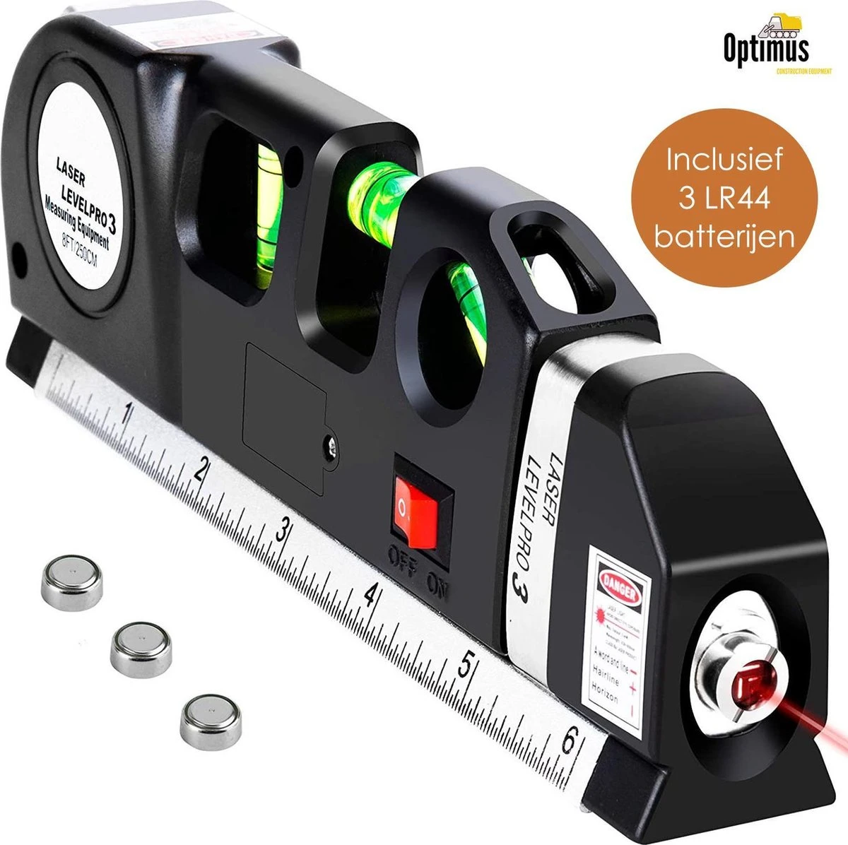 De Optimus Laserwaterpas komt met 3 LR44 knoopcelbatterijen inbegrepen.