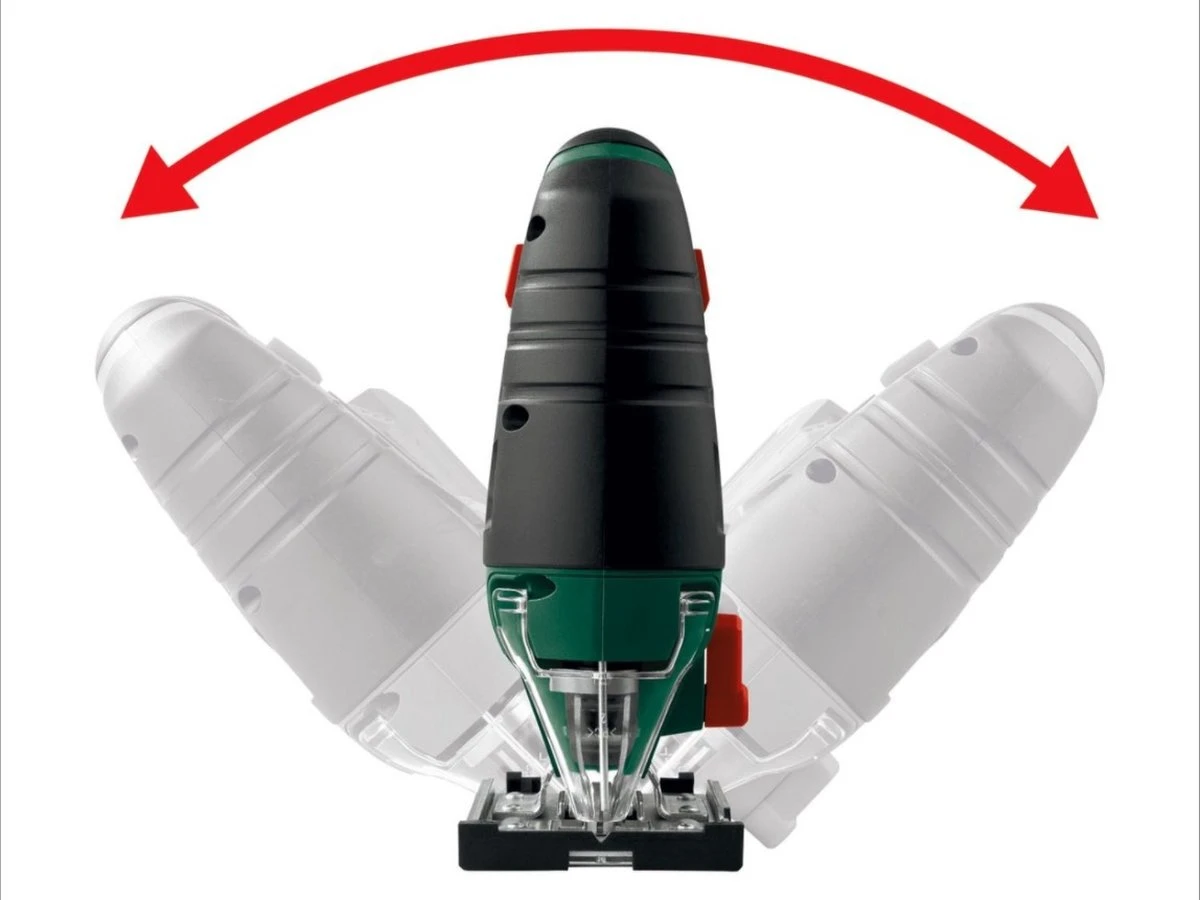 - De decoupeerzaag heeft een snelle voortgang en kan soepel bochten zagen door de in 3 standen instelbare pendelslag