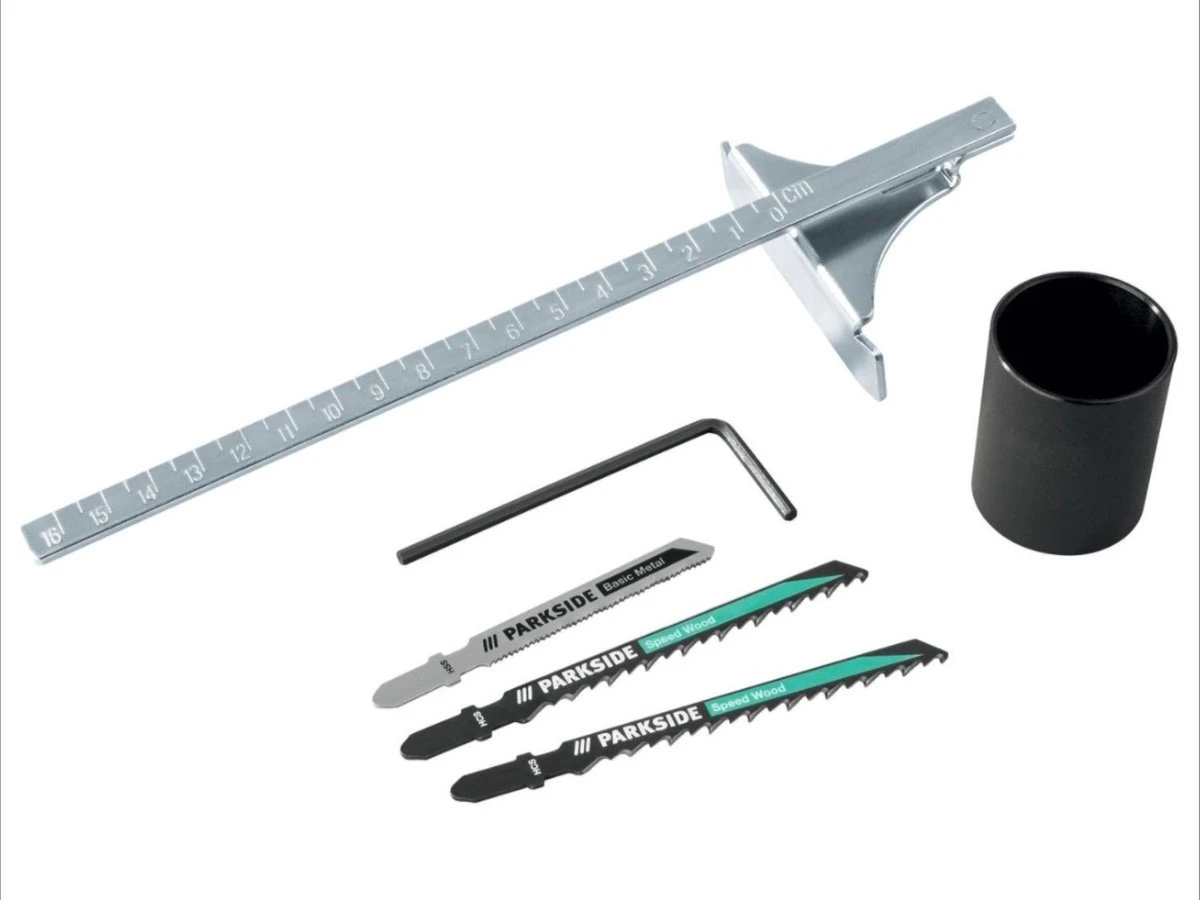 Inclusief 2 zaagjes voor hout en 1 voor metaal, parallelaanslag, inbussleutel, adapter voor externe stofafzuiging en transportkoffer