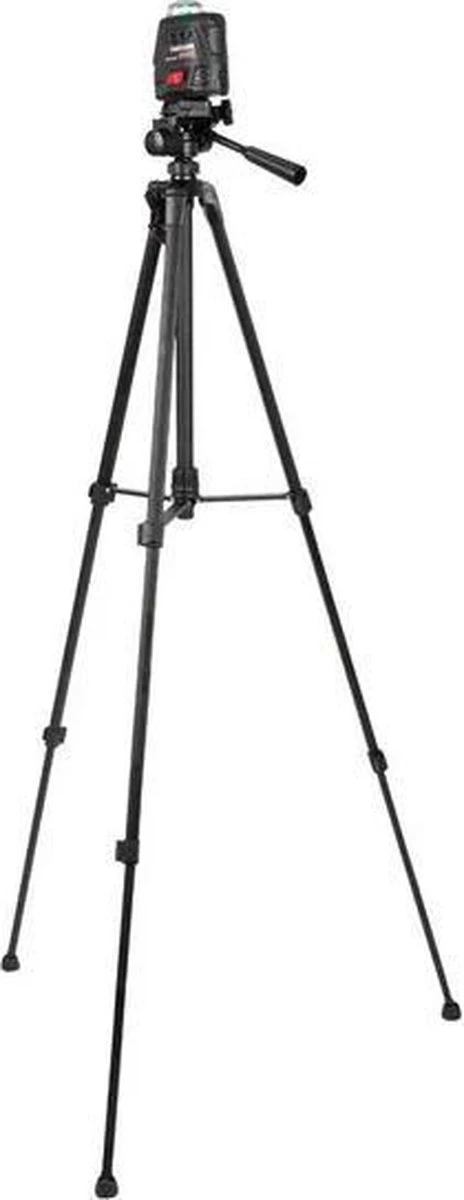 De kruislijnlaser heeft een compacte behuizing met 6,35 mm-statiefhouder en laadaansluiting. Het driepootstatief met verlengbare middenzuil via zwengel zorgt ervoor dat je laser altijd nauwkeurig meet en dat je gemakkelijk op hoogte kan werken (max. hoogte 1,5 m).
