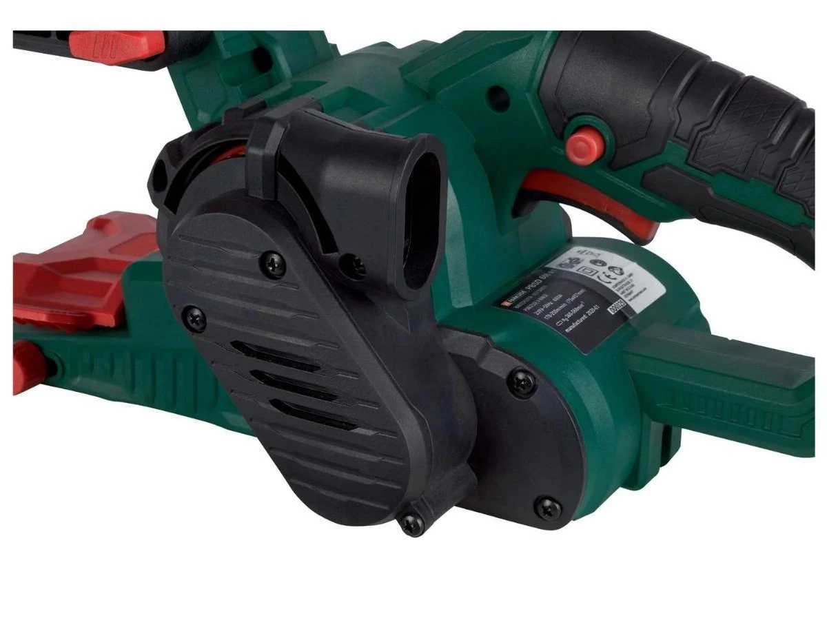- Deze schuurmachine heeft een afdekking aan de voorkant die naar boven kan worden geklapt om bij moeilijk toegankelijke oppervlakken te komen of dicht bij de rand te kunnen schuren, in omlaag geklapte toestand dient deze als kopse afstandshouder