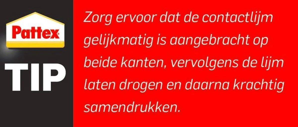 2. Breng de Pattex lijm op beide oppervlakken aan en laat ongeveer 10-15 minuten drogen, zodat de oplosmiddelen kunnen verdampen. Als de lijm droog is, moeten beide oppervlakken stevig tegen elkaar gedrukt worden.